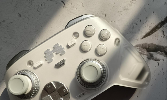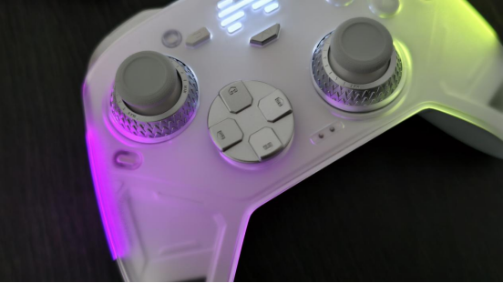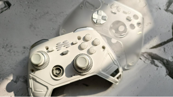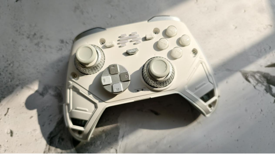 手柄的整体造型采用了经典的人体工学设计,完美贴合手掌曲线 ,握感非常舒适。我这种手比较大的人握着也不会觉得局促,长时间使用下来,手部也不容易感到疲劳。手柄正面采用的是半透明磨砂材质的外壳,不仅看起来很有科技感,摸起来也十分舒服,有一种独特的朦胧美感。背面握把处则是亲肤硅胶材质,手感细腻,而且防滑效果出色,即使手心出汗也不用担心手柄会滑落。