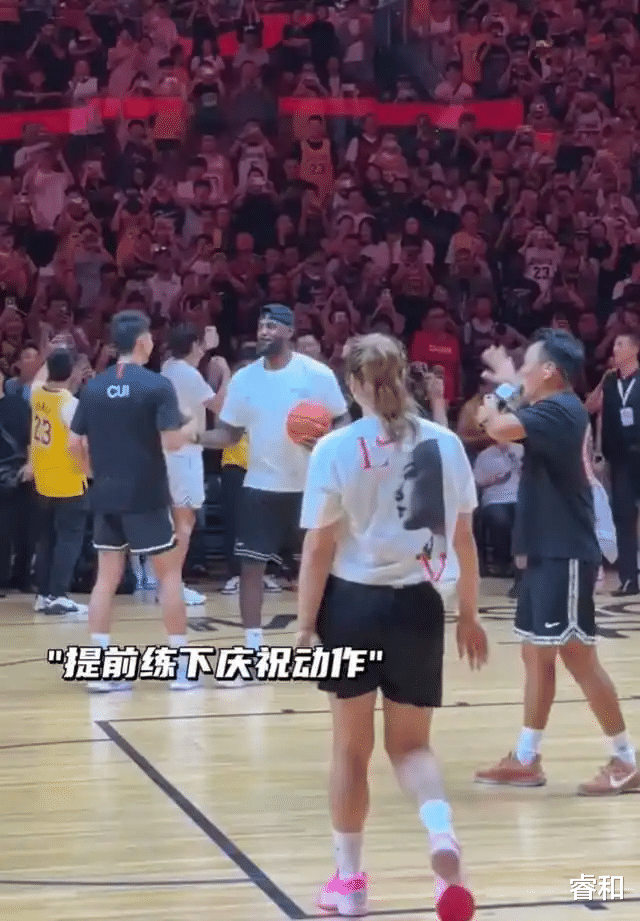 在活动现场,当詹姆斯完成标志性扣篮后,引爆全场,现场嘉宾纷纷与詹姆斯击掌庆祝,此时李梦从场边走入球场,做出了一个令现场观众惊喜的动作——她模仿起詹姆斯标志性的“霸王步”庆祝动作,步伐有力、神情投入,仿佛这一刻她不仅是粉丝,更是与偶像同频的运动员。