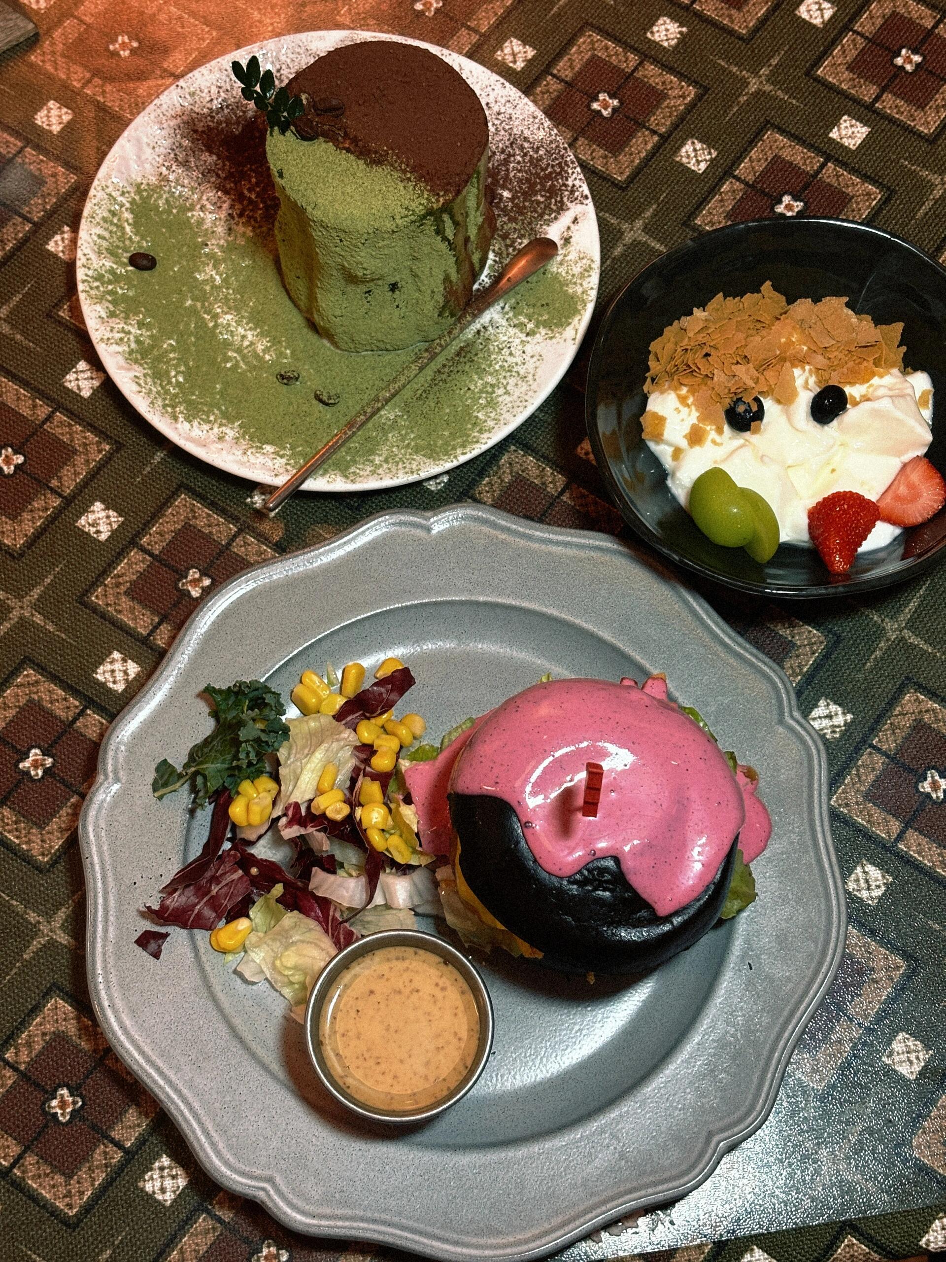 视觉炸裂程度300%!!玫红色火龙果果酱 x 全黑贝果的配色简直犯规!手打肉饼筋道又多汁,搭配金黄酥脆的薯条简直就是罪恶源泉~配上特制酱料好吃到直接原地蹦迪!