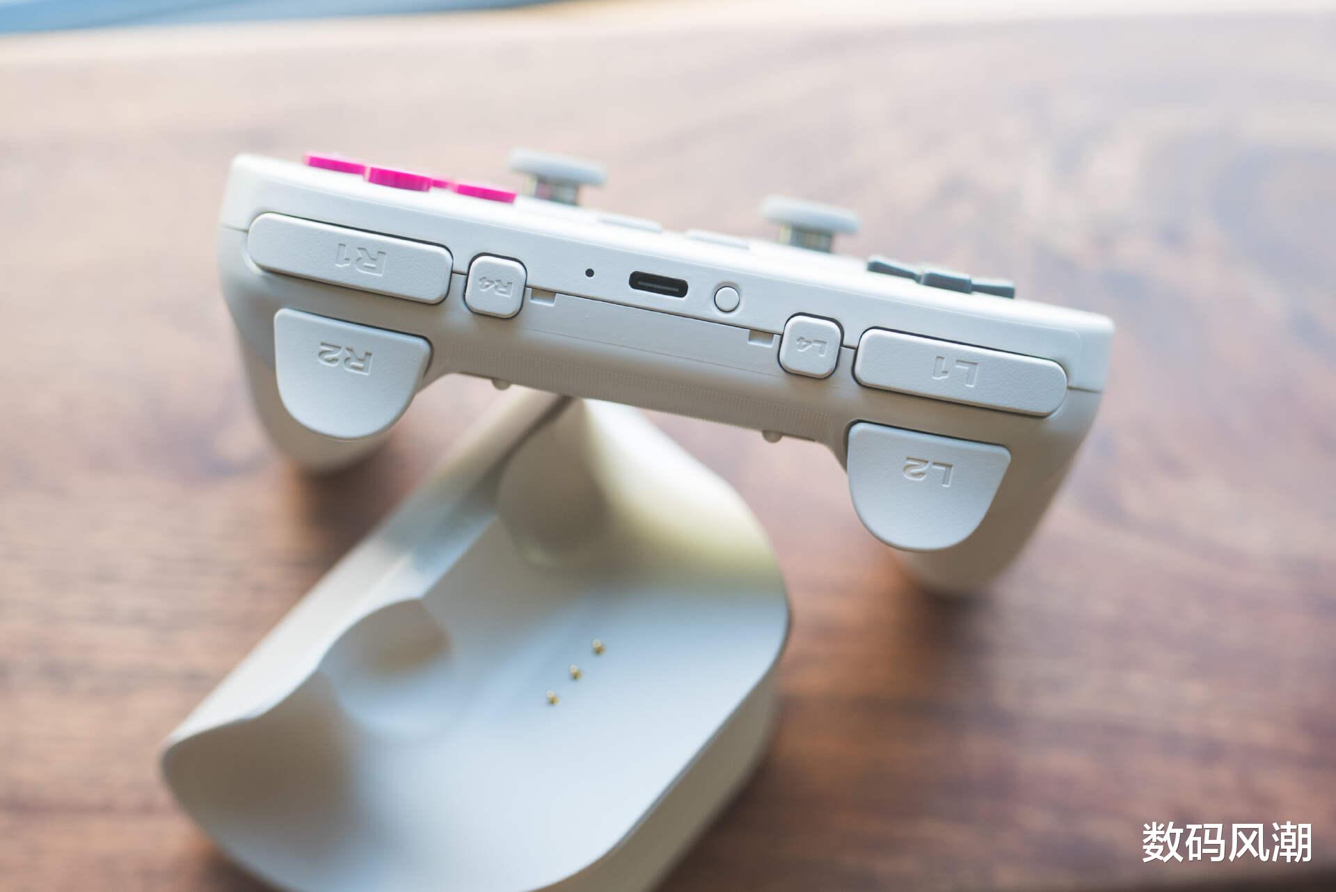游戏结束后不自觉的放置在充电底座上,不由肯定这样完全符合直觉的好设计。拿起即开机,放下即充电,其实完全可以忘记可达20小时的超长续航表现。当然外出也可以使用顶部C口充电,1000mAh的大电池足以保证高强度的游玩使用。