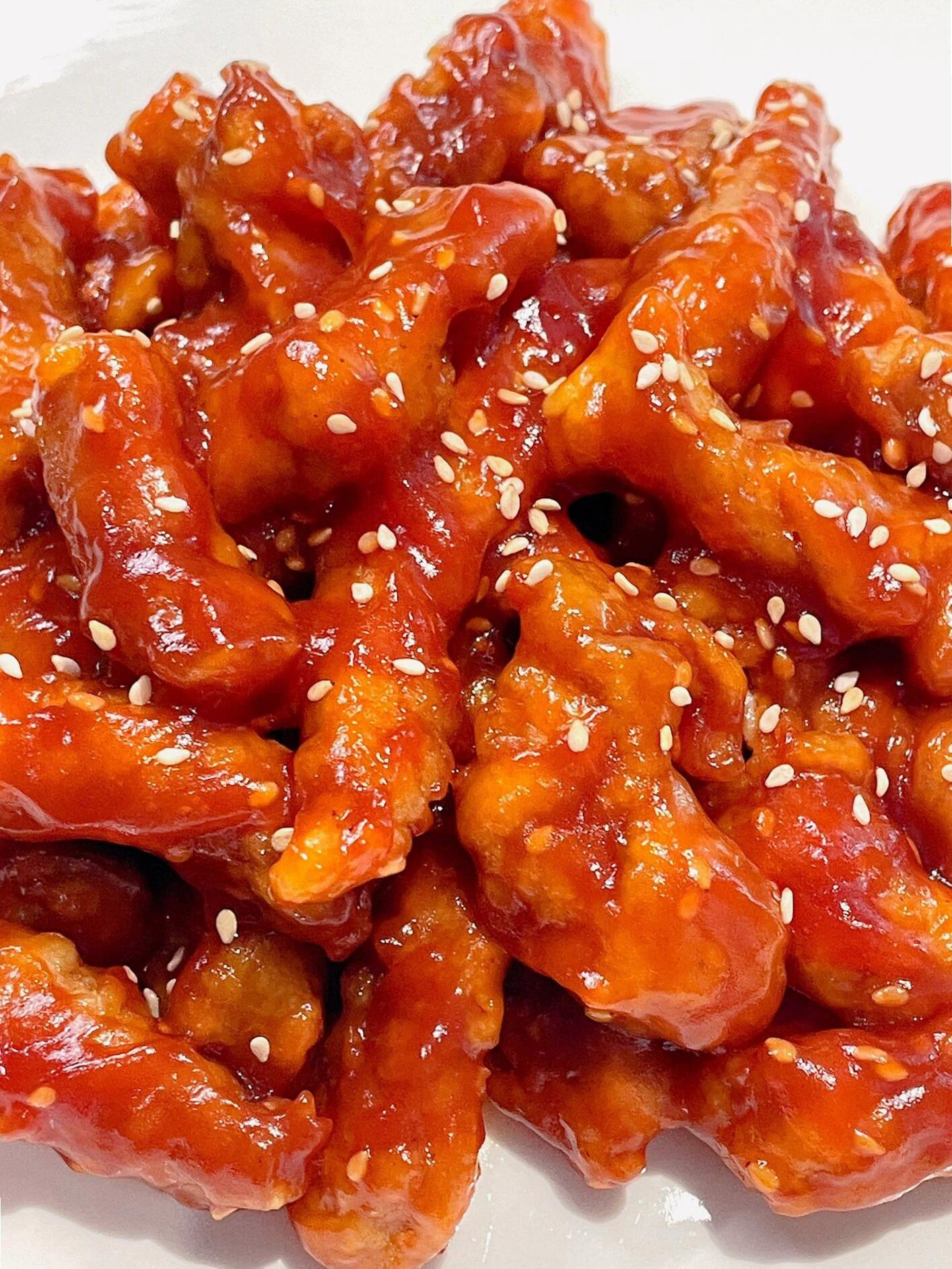接下来就是最有趣的“穿衣”环节了。把腌好的肉条倒进淀粉糊里,让每一根都均匀裹上“白纱”。这时候油锅也该热起来了,建议使用味道清淡的玉米油或花生油,油温烧至六成热(筷子插入周围冒小泡)最合适。把裹好粉的肉条一根根放入油锅,千万别一股脑倒进去,否则会粘在一起。第一次炸至微黄捞出,大约需要3-4分钟。等所有肉条炸完第一遍后,开大火将油温升至八成热,把肉条全部倒回去复炸30秒。这“一炸熟、二炸酥”的秘诀,能让外壳达到惊人的酥脆度!