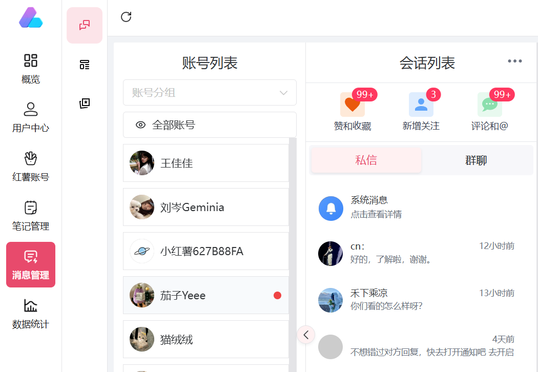 聚合引流的关键技术最多的板块,所有的账号统一聚合进来,让回复更高效,不错过每一个商机信息