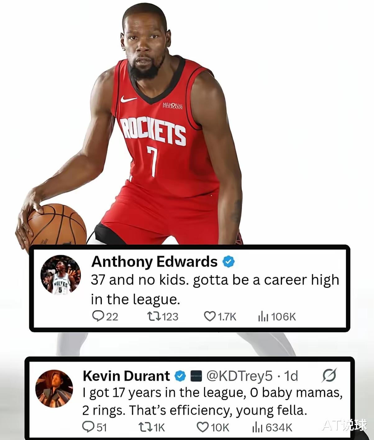 近日,爱德华兹和杜兰特在社交媒体上发生了一起有趣的互动。在火箭发布杜兰特身穿新球衣的定妆照后,爱德华兹评论调侃,37岁还没孩子的杜兰特,创造了职业生涯新高。