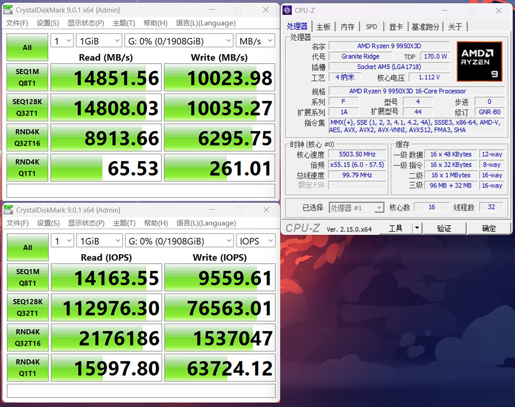 首先说明一下,固态硬盘的性能测试结果会受硬件平台的影响,包括处理器性能或主板接口等多种因素,并非都能跑到官方所标称速度,在AMD锐龙9 9950X3D平台上进行测试,宏碁掠夺者GM9固态硬盘的顺序读取速度为14851MB/s,顺序写入速度为10023MB/s,4K单线程读写速度为65.53MB/s与261MB/s。