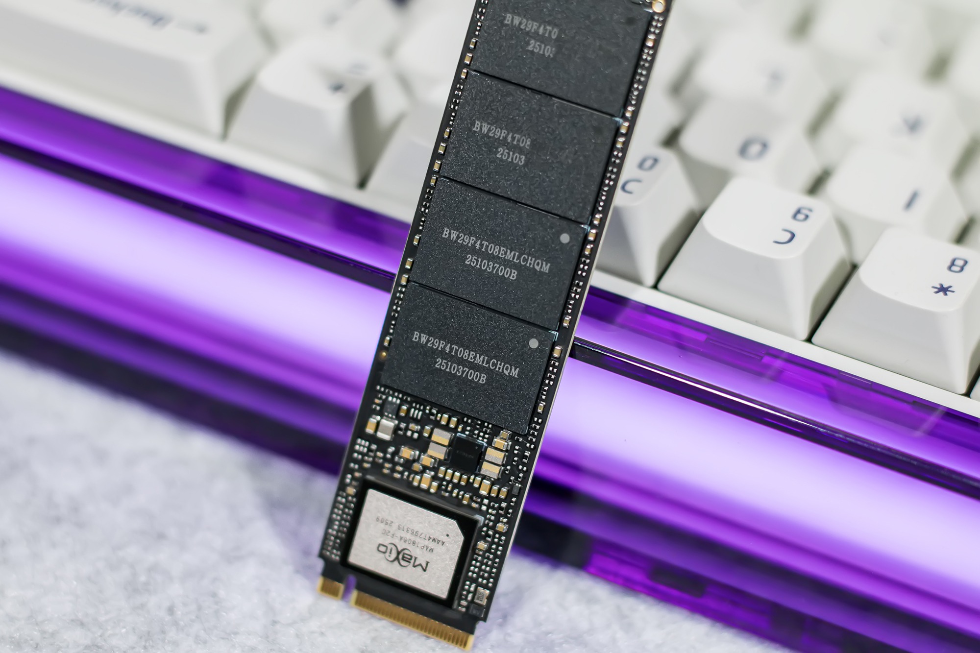 固态硬盘共提供了1TB、2TB与4TB三种不同容量规格可选,手上的是2TB容量版本,配备四颗3D TLC闪存颗粒,表面丝印编号为BW29F4T08EMLCHQM,单颗容量为512GB,四颗共组成2TB的总容量,闪存颗粒由佰维自家进行封装,佰维是国内极少数具备先进封装技术的国产存储厂商,对于闪存颗粒的品质和稳定性更有保障,经过查询是美光的B58R 232层堆叠TLC闪存颗粒。