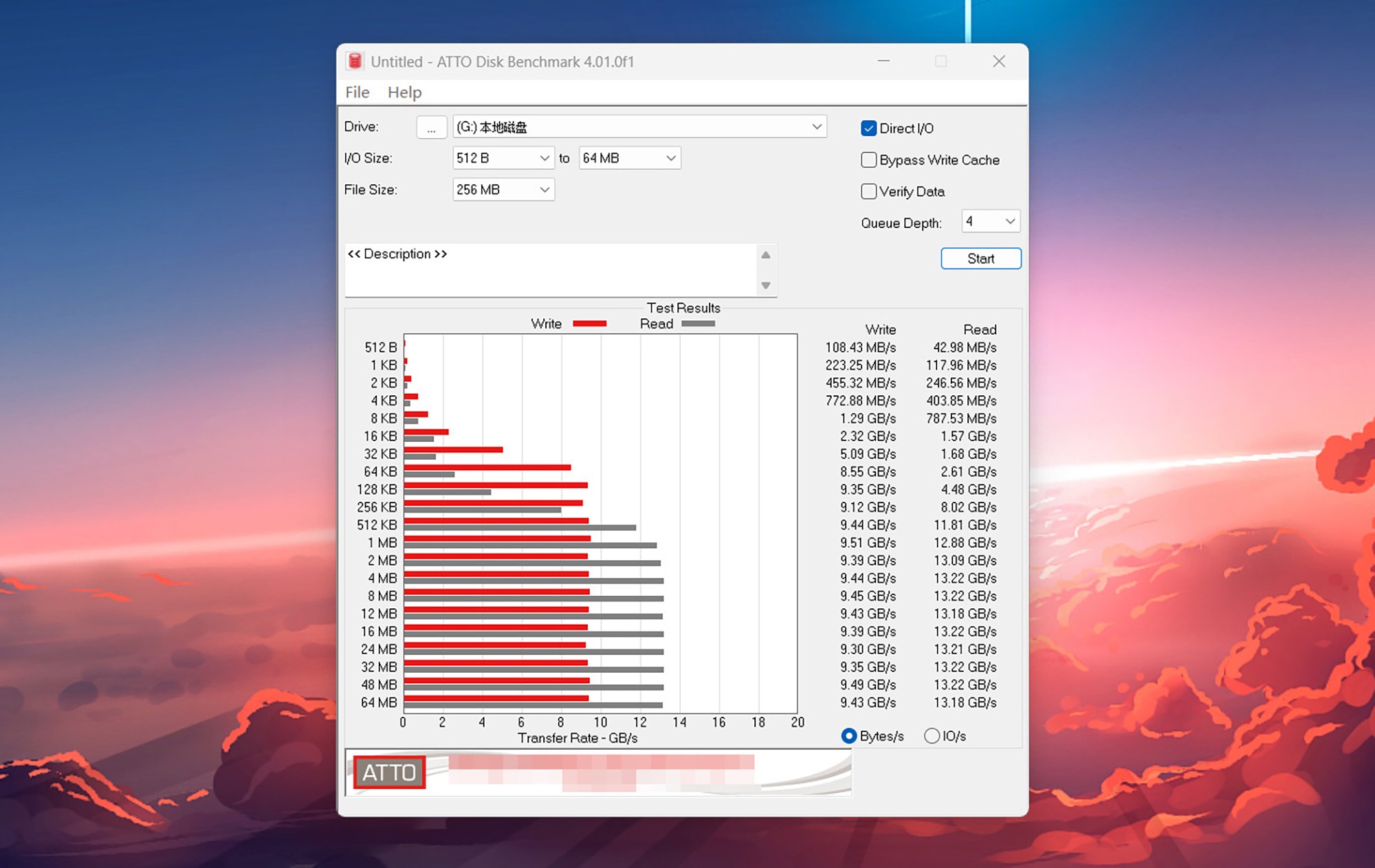 ATTO Disk Benchmark基准性能测试软件,可测试固态硬盘在不同大小文件读写速度,测试结果如下图,最小的512B的读写速度为43MB/s与108MB/s,4K文件读写速度为403 MB/s与772 MB/s,当文件大小在512KB以上基本达到满速,而最大读取写入速度分别为13.22GB/s与9.49GB/s。