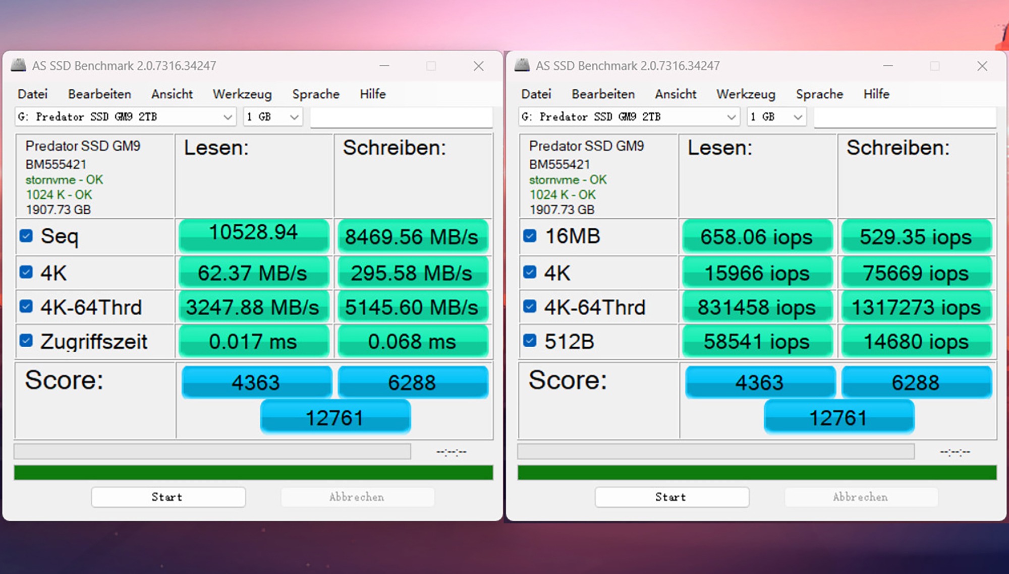 接着是AS SSD Benchmark基准性能测试软件,实测宏碁掠夺者GM9固态硬盘的顺序读取写入速度分别达到10528.94MB/s与8469.56MB/s,而4K单线程读写速度分别为62.37MB/s与295.58MB/s,总成绩为12761分,手上的PCIe4.0旗舰款固态硬盘的成绩也就9000多,不论是读写速度还是综合评分都远超旗舰级PCIe4.0固态硬盘。