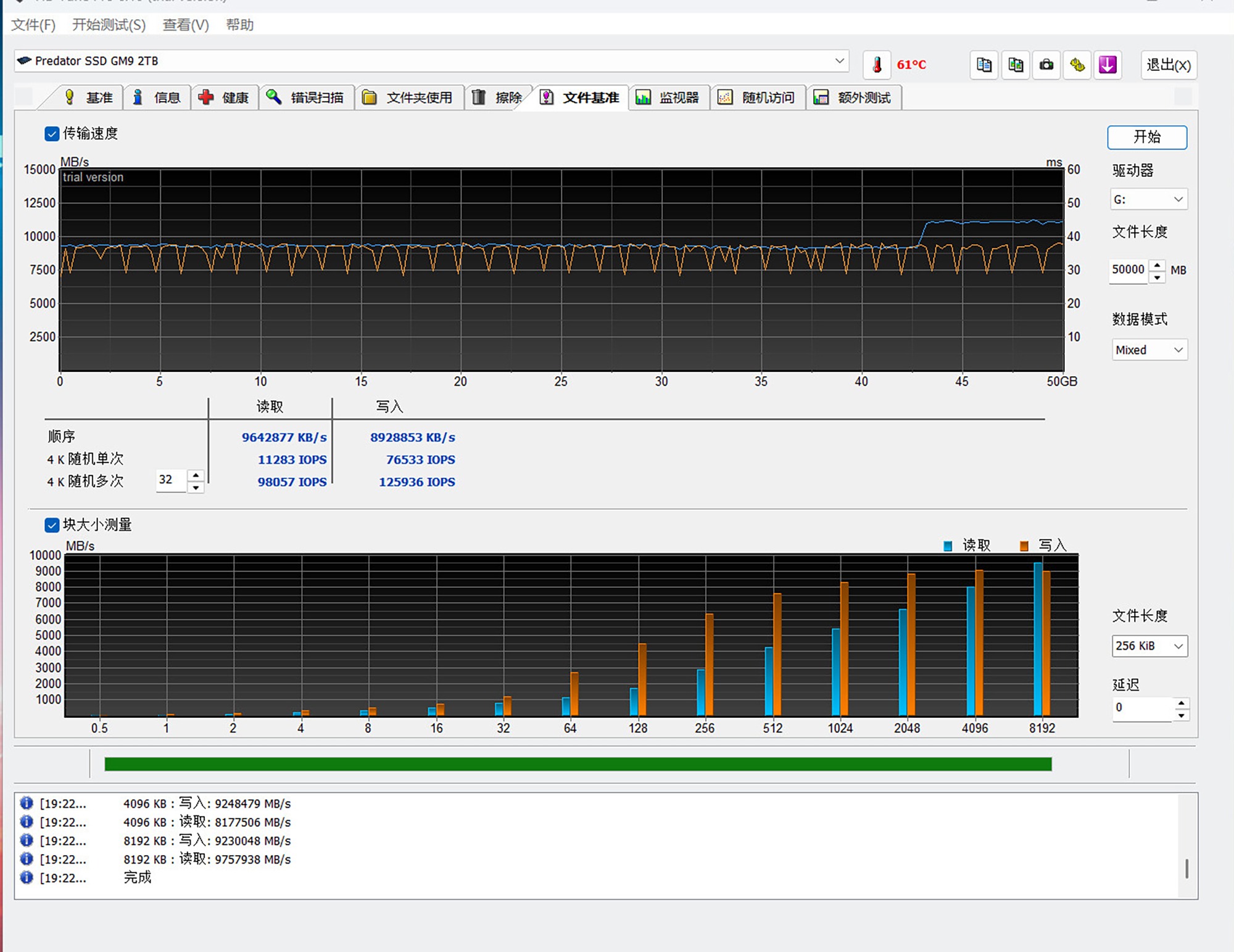 HD Ture Pro基准性能测试软件,本次选择是文件基准测试项目,文件大小为50GB混合模式,相当于分别读写一个50GB体积的文件,从测试结果来看,读取速度为9642MB/s,写入速度为8928MB/s,块大小测量并没显示详细的速度,从柱状图结果看跟ATTO差不多。