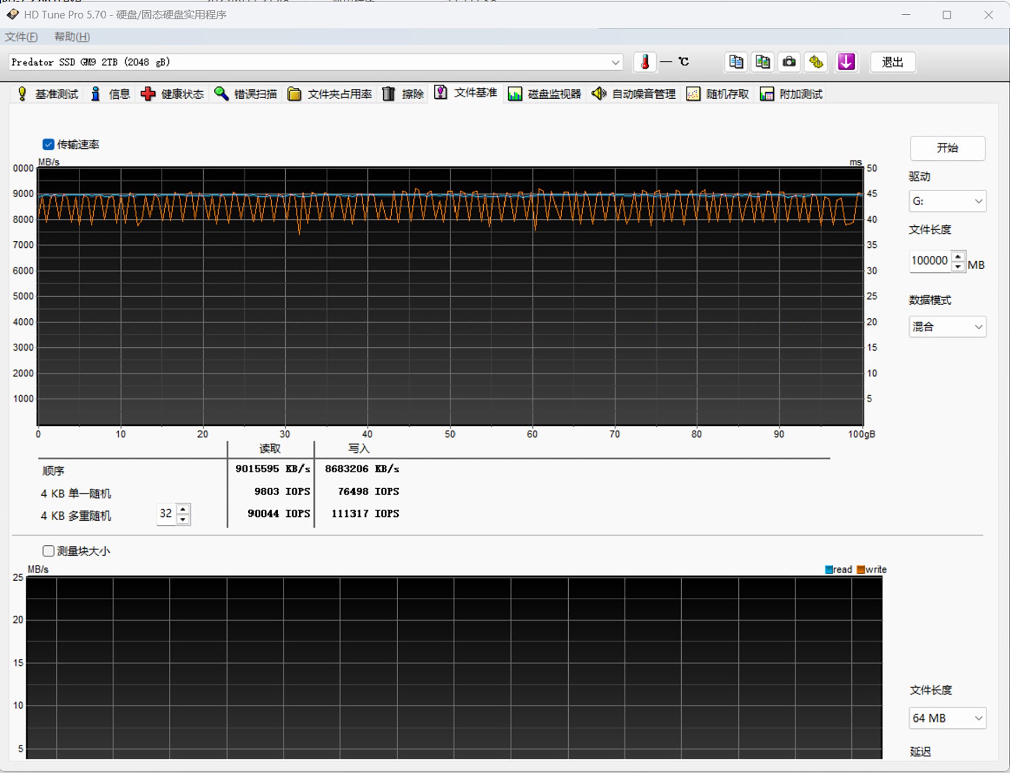 HD Ture Pro软件中的文件基准测试项目,将文件大小设为100GB与混合模式,在存储空间占用率达到90%状态下,写入速度为8683 MB/s,读取速度为9015MB/s,速度曲线并没明显波动,整体读写速度表现与空盘状态下基本一致。