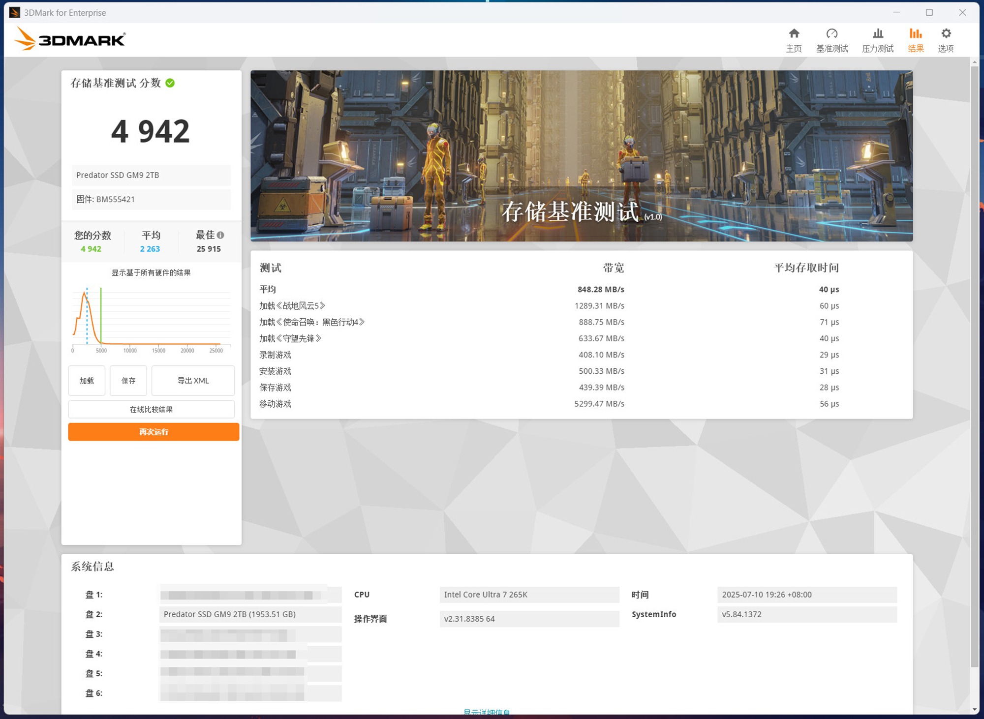 3DMark基准性能测试软件,本次选择存储基准测试项目,模拟游戏加载游戏数据移动等操作,接近实际的使用情况,宏碁掠夺者GM9 2TB固态硬盘在该项目中的得分为4942,平均带宽为848MB/s,在加载《战地风云5》游戏时带宽为1289MB/s,移动游戏时带宽为5299MB/s。