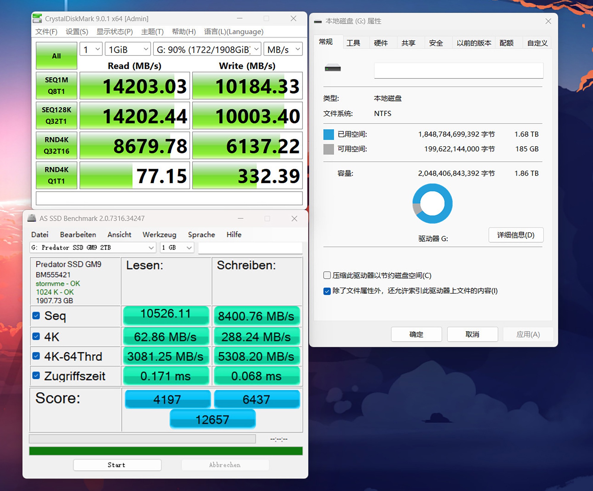 在宏碁掠夺者GM9固态硬盘存储空间占用率达到90%状态下,CrystalDiskMark软件所测得顺序读取写入速度分别为14203MB/s与10184MB/s,而4K单线程随机读取写入速度分别为77MB/s与330MB/s,AS SSD Benchmark软件所测得顺序读取写入速度分别为10525MB/s与8400MB/s,评分为12657,无论是读写速度还是软件评分成绩,与空盘状态下并无区别。