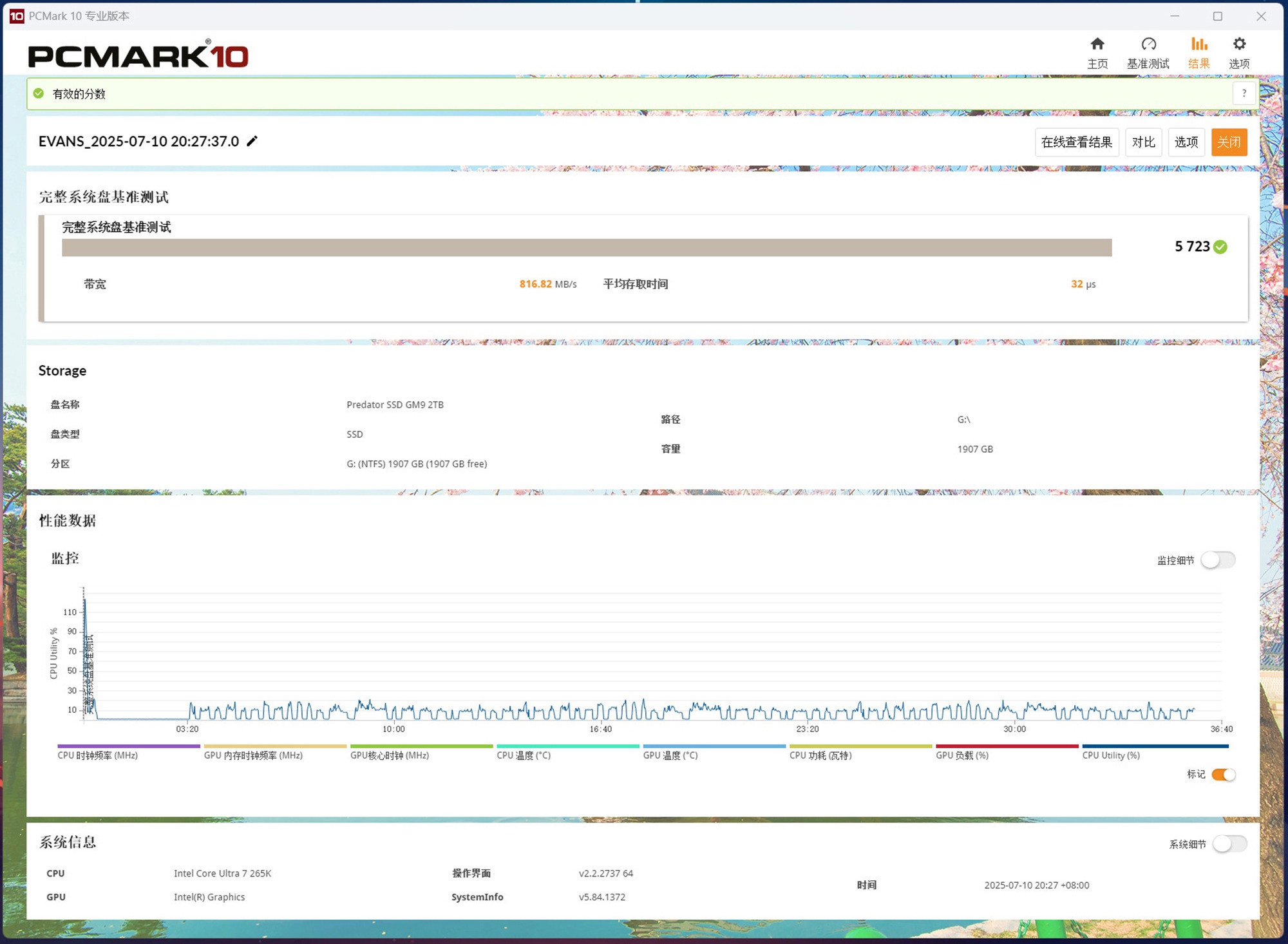 PCMark基准性能测试软件,完整系统盘基准测试项目,能测试固态硬盘作为主系统盘状态下的性能表现,宏碁掠夺者GM9 2TB固态硬盘在该项目中的测试成绩为5723分,平均传输带宽是816MB/s,平均存取时间为32μs,旗舰级PCIe4.0固态硬盘成绩也就4500分左右。