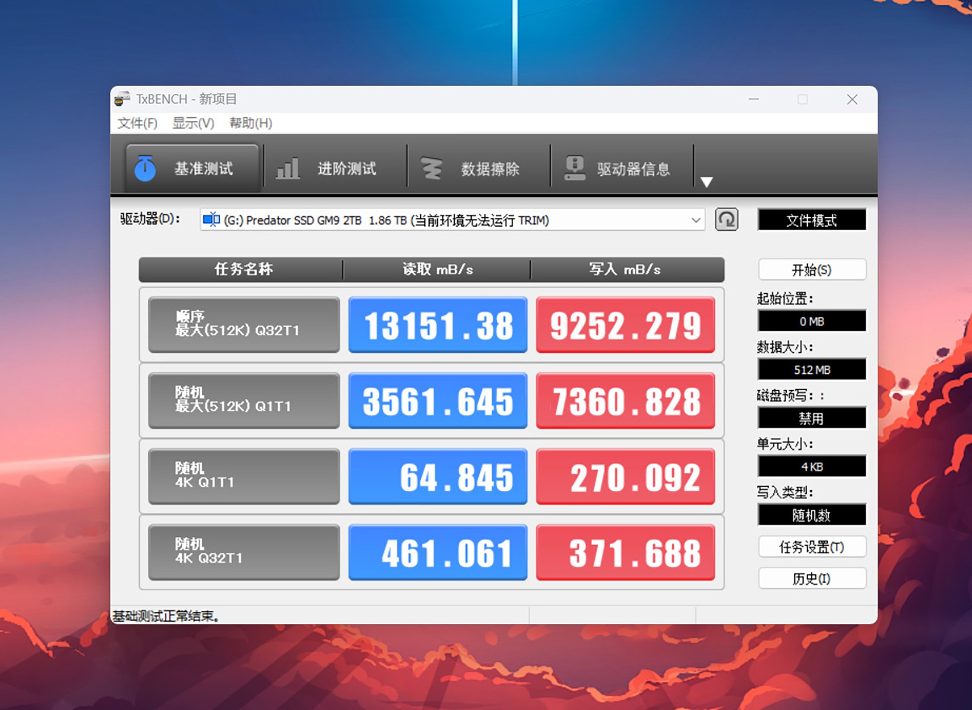TxBENCH基准性能测试软件,实测宏碁掠夺者GM9固态硬盘顺序读取写入速度为13151.38 MB/s与9252.27MB/s,4K单线程随机读取写入速度为64.845MB/s与270.092MB/s,测试结果与上面的CrystalDiskMark软件相近。