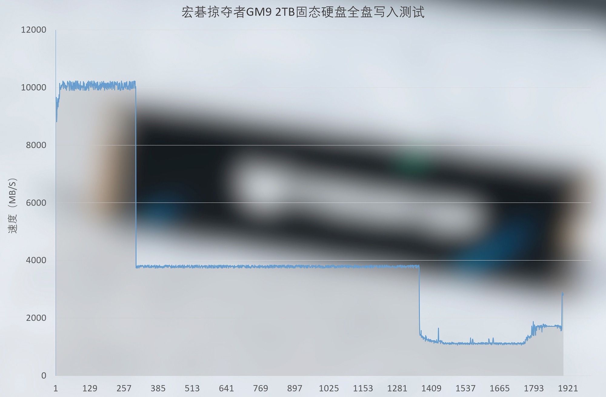 压力最高的全盘连续写入测试,从结果图表可见,宏碁掠夺者GM9 2TB固态硬盘属于是较常见的三段式写入速度,在空盘状态下SLC缓存空间在300GB左右,此时写入速度能达到10000 MB/s,然后进入TLC直写阶段,此时写入速度约为3800MB/s,第三段是GC回收阶段,此时写入速度为1200MB/s,当回收结束后速度稍微提升,全盘写入总耗时约16分钟。