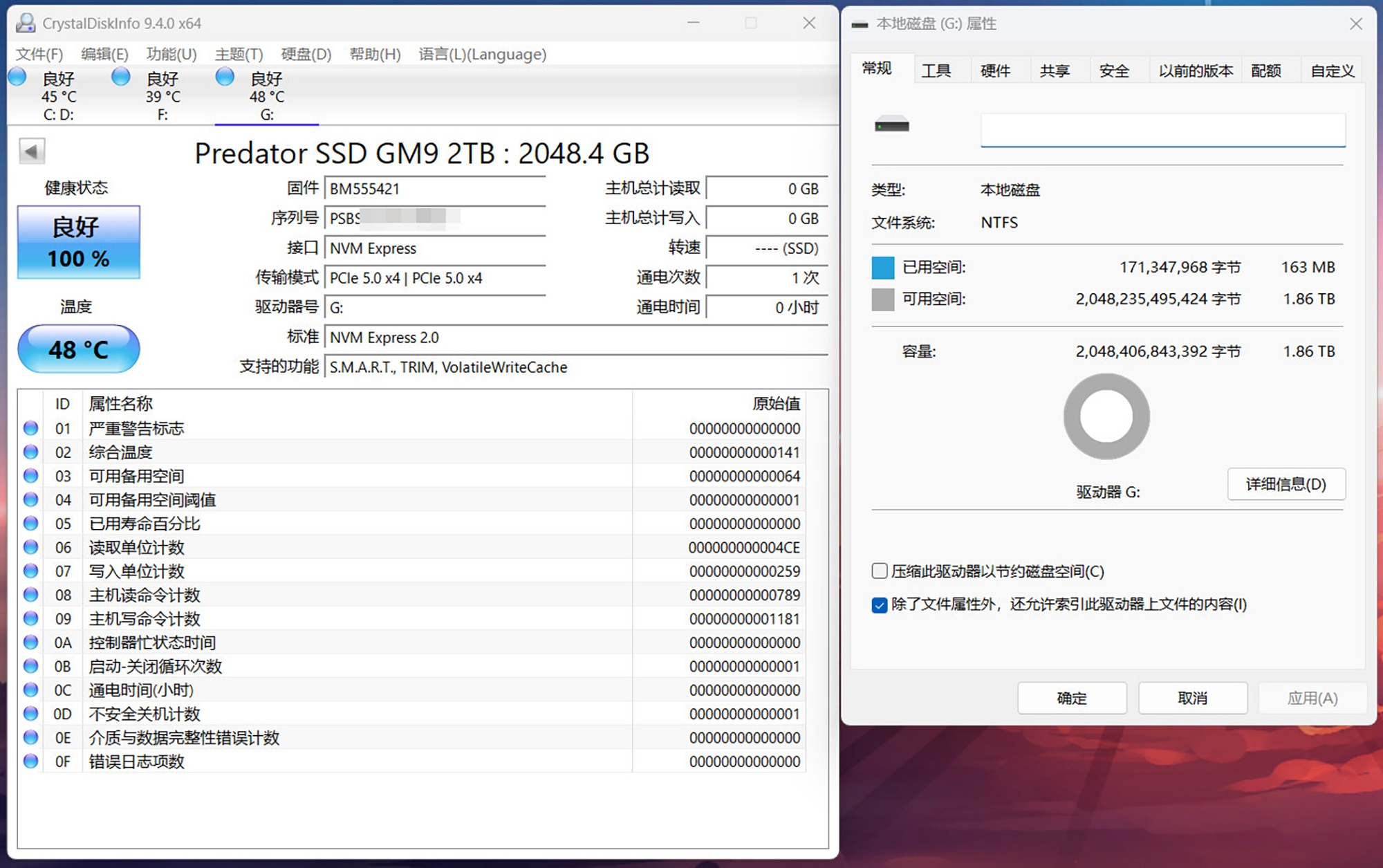 主板自带一块铝合金材质散热模块,相较于石墨烯散热片,散热模块的降温效果会更好,在CrystalDiskInfo检测软件中看到,宏碁掠夺者GM9固态硬盘2TB版的容量为2048.4GB(十进制),系统显示用户实际可用容量为1.86TB,当前传输模式为PCIe 5.0×4,采用NVMe 2.0协议标准。