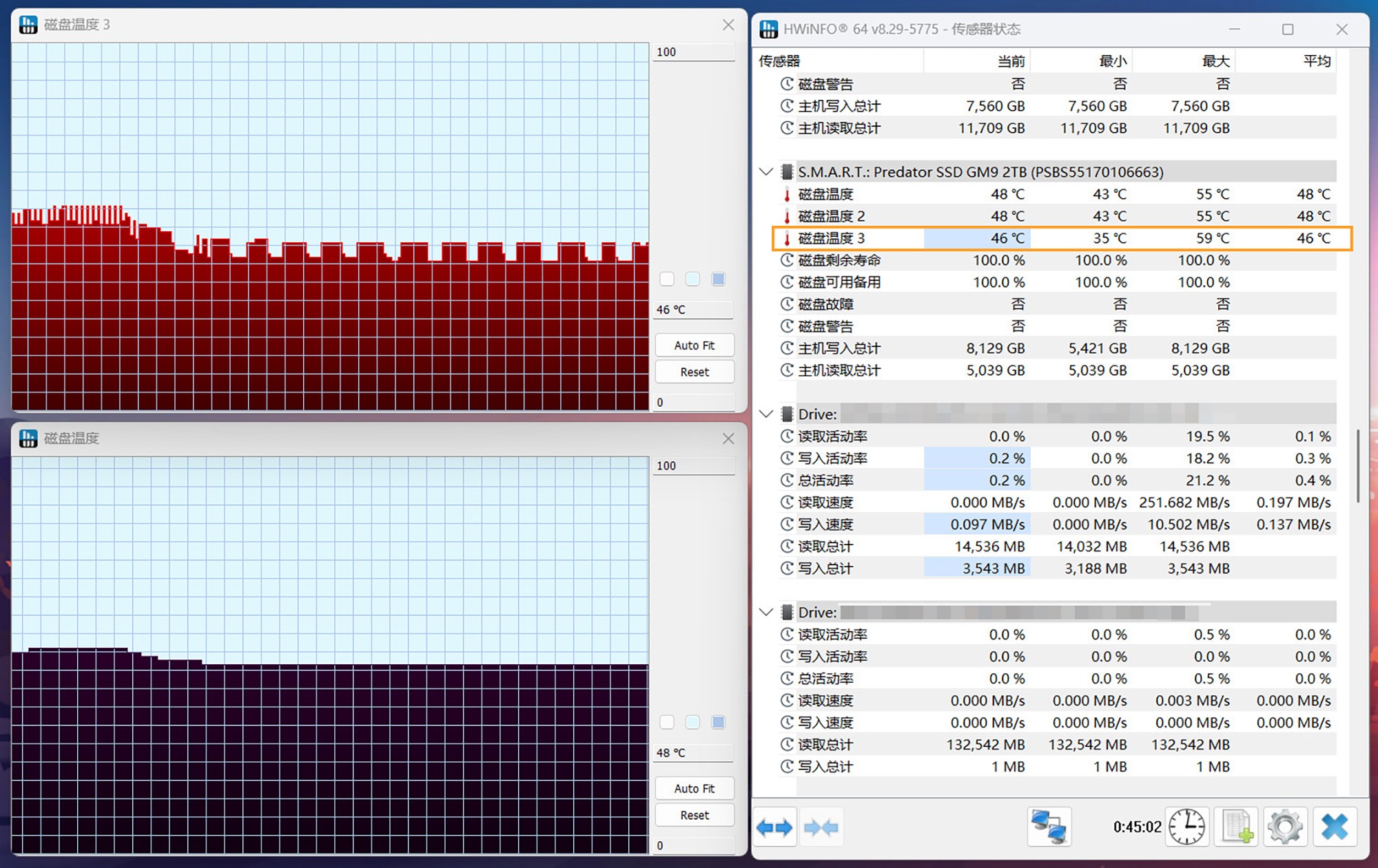 最后是温度测试,测试环境温度约为28℃,本次搭配厚实铝合金散热模块,据检测软件所显示,固态硬盘提供了三个温度数据,磁盘温度3应该是主控芯片传感器温度,其余两个应该是闪存颗粒传感器温度,记录了在全盘写入测试期间的温度,显示固态硬盘的最高温度仅为59℃。