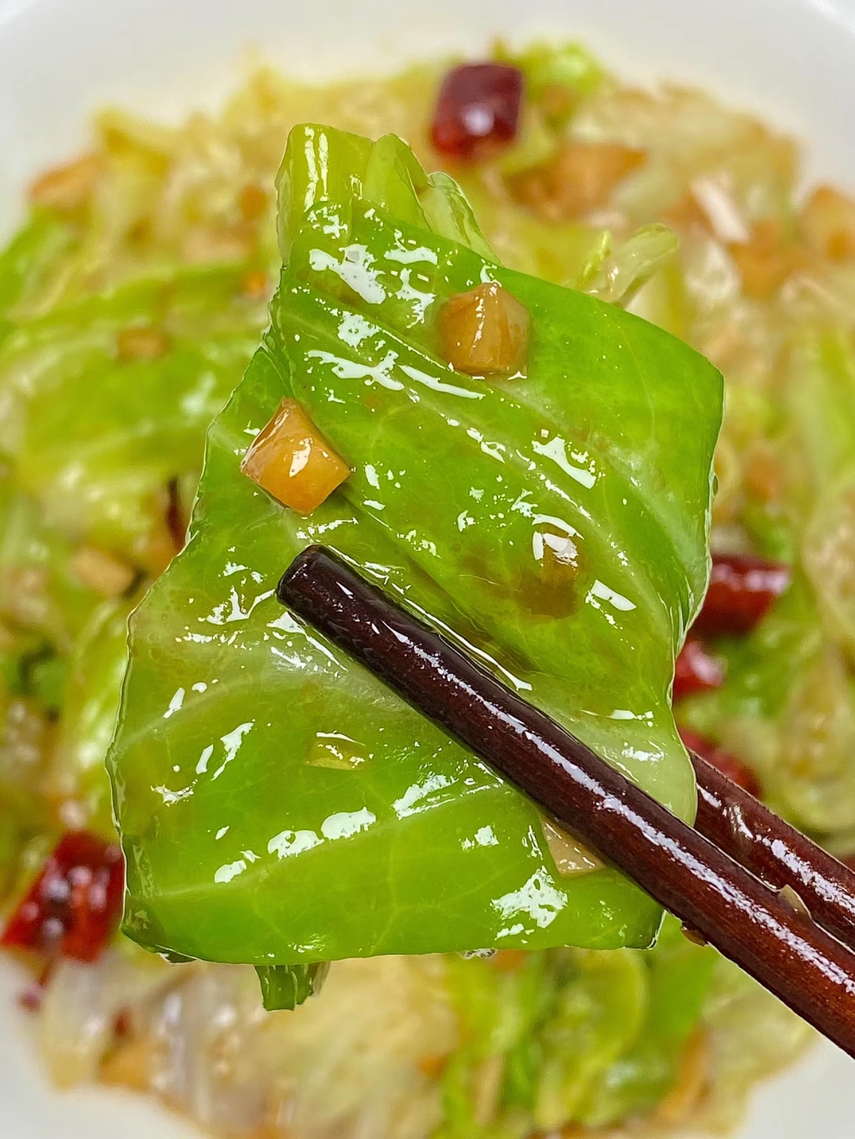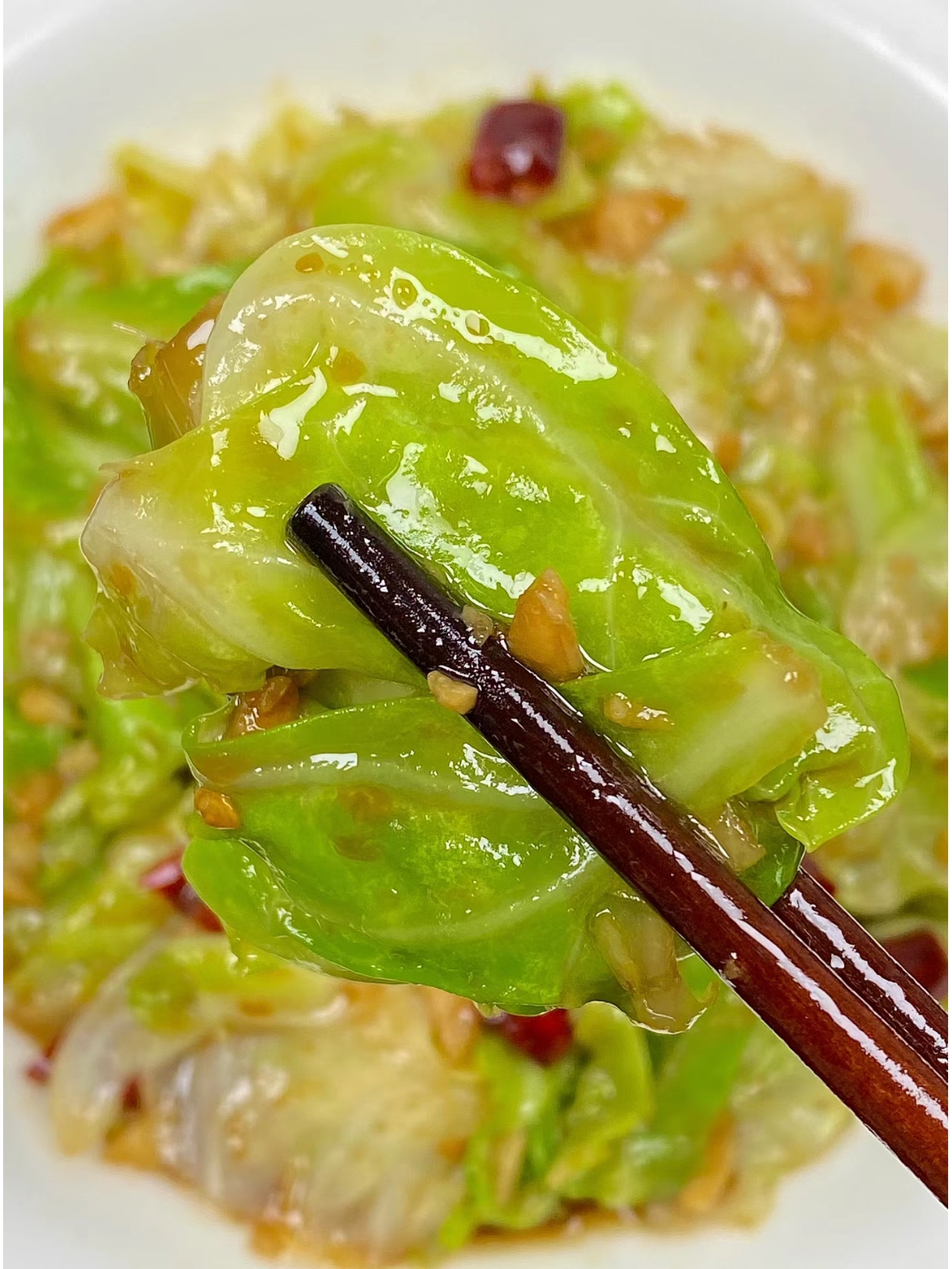 - 当包菜略显蔫软但仍保持爽脆时,淋上几滴醋,快速翻炒几下。