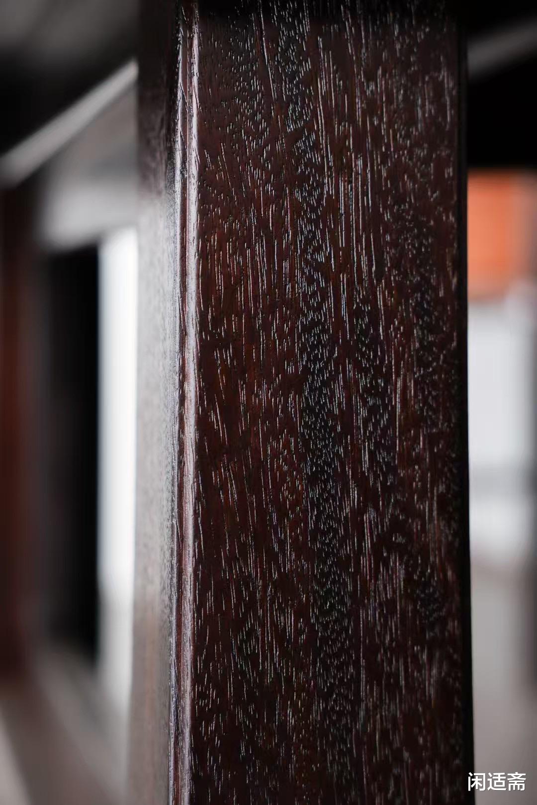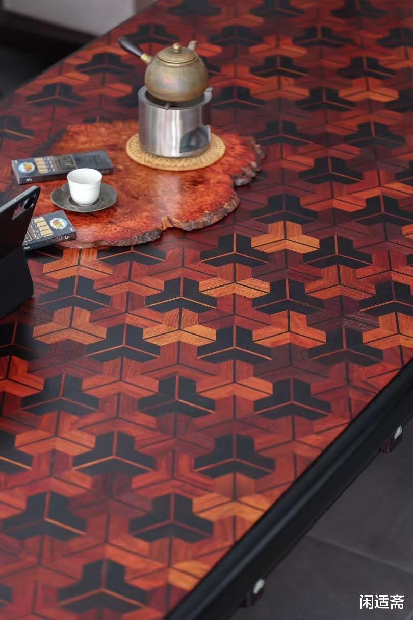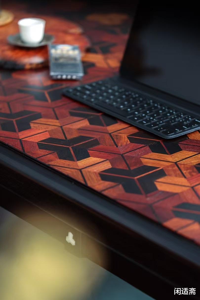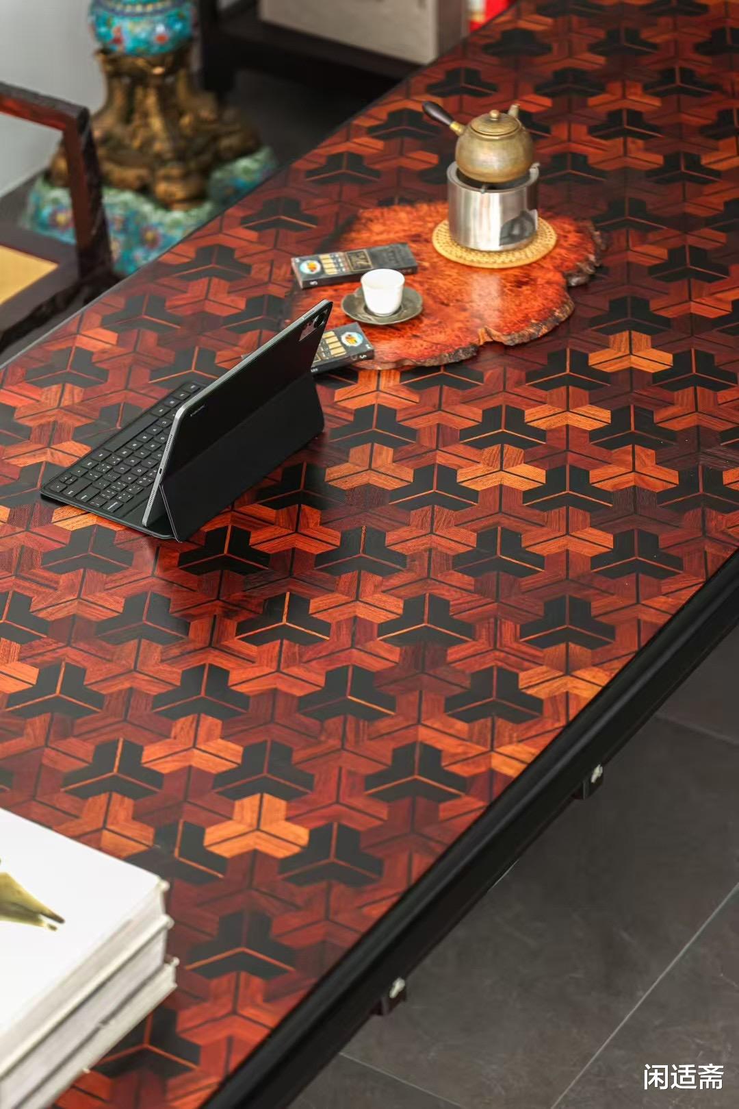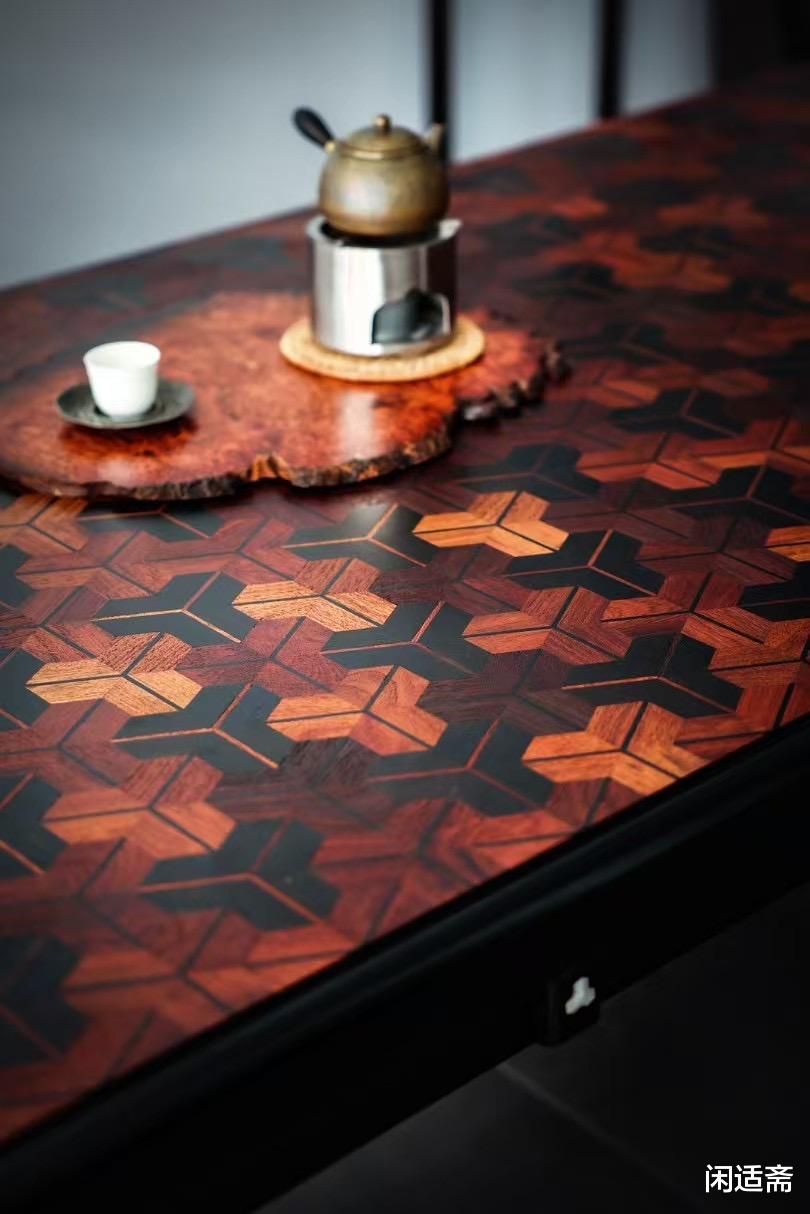 此件大案精选老料铁力木打造主体,铁力木素有“木中硬汉”之称,木质坚硬致密、结构稳定。桌面采用纯榫卯攒拼工艺,以大果紫檀与赞比亚紫檀精妙搭配,两种珍稀紫檀纹理互补、色泽相衬,增添视觉美感。更值得称道的是桌面的非遗工艺加持,髹涂纯植物大漆,取自天然漆树的漆料无毒环保,经多道髹漆、打磨工序后,漆面如玉石般温润通透,将木材纹理隐隐透出,兼具防护与美学双重价值。