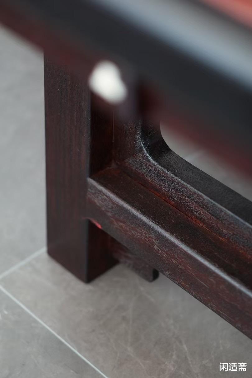 器型设计遵循明式简约风骨,比例舒展协调,无繁复雕饰却自带雅致气场。案面平整开阔,边缘线条圆润柔和,搭配粗壮利落的方腿造型,既保证了使用空间的充足,又彰显出沉稳大气的格调。细节处暗藏巧思,腿足与案面衔接稳固,整体重心沉稳,简约中透着独特个性。