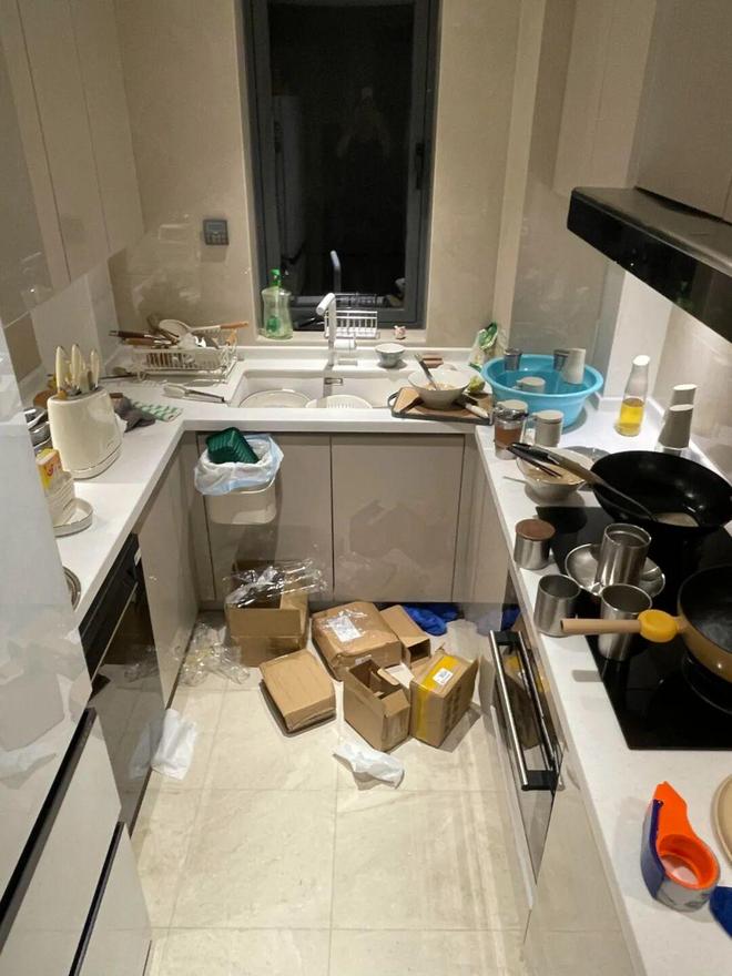 堆满餐具的水槽、乱七八糟的调料瓶、没用完的食材,以及布满油渍的台面……简直是让人不忍直视。