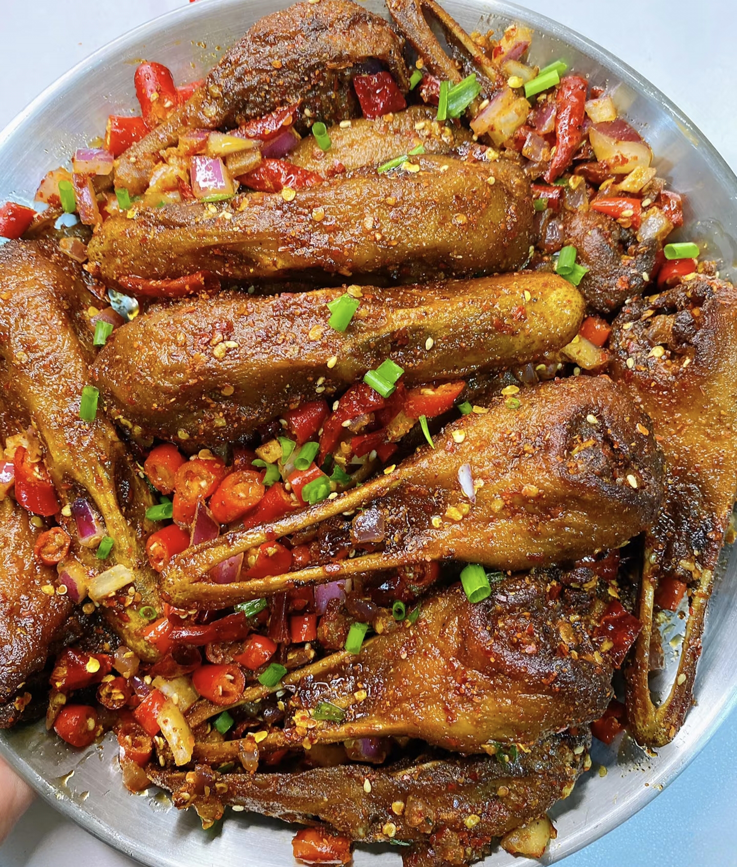 锅中留少许底油,小火炒香椒盐粉和辣椒粉,倒入炸好的鸭头快速翻炒,让每块都裹满香料。出锅前撒把葱花,瞬间香气四溢!