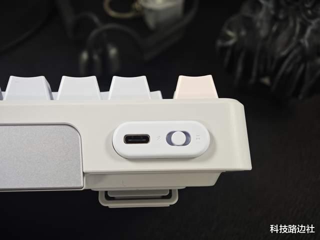 键盘前端是USB-C接口,可充电或使用有线连接;旁边的按键用于蓝牙5.0/有线/2.4G模式切换。