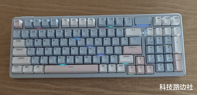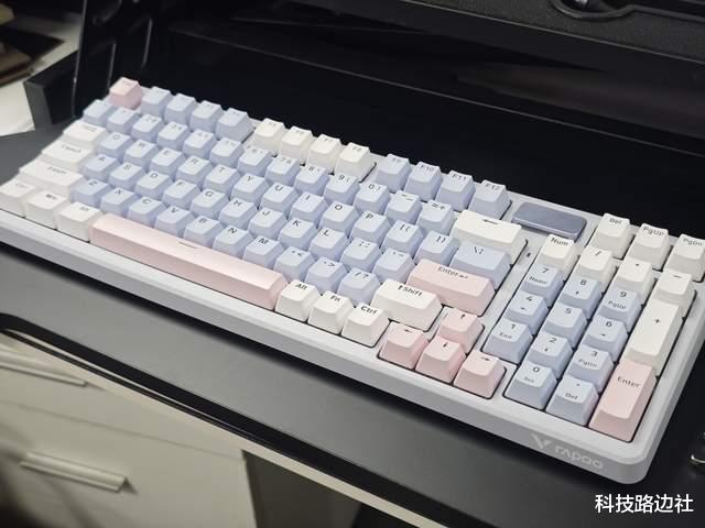 先来看看雷柏V700DIY-98莫奈仙踪配色的设计,采用了蓝白粉三色的撞色方案,整个键盘界面清新淡雅。虽然是98键排列,但整体键帽间距更紧凑,提升了输入效率。我个人偏爱带数字键的键盘,使用起来会更方便。