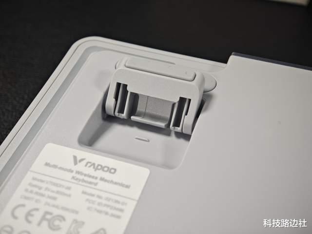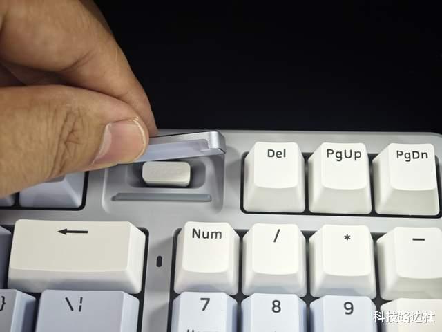 雷柏V700DIY-98的2.4G接收器收纳仓设计非常巧妙,位于回车键上方,采用铝合金材质的磁吸盖子,既容易翻开又不易脱落。以往收纳仓多放在底部或前端,放在正面的并不多见。此外,下方的LED灯条也是键盘的电量指示灯,可通过FN+空格键查看电量状态,电量程度用不同颜色表示。