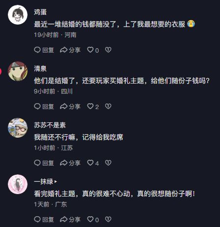 两大游戏的婚礼主题内容曝光后,玩家在评论区展开了激烈讨论。有玩家质疑:“这两款游戏难道是要‘结婚’,还得让玩家购买婚礼主题相关道具,相当于给它们‘随份子钱’吗?”也有玩家表达了不同看法:“看完这些婚礼主题的内容,实在让人难以抗拒,真的很想入手相关道具,就像心甘情愿‘随份子’一样。”