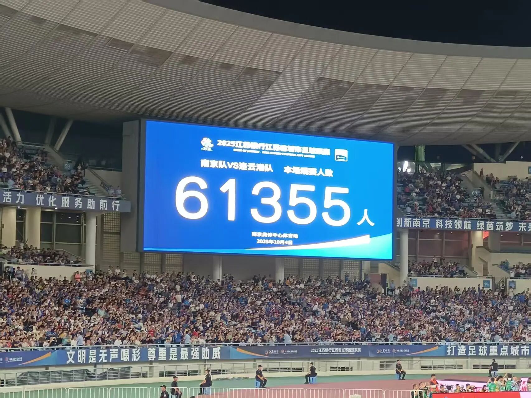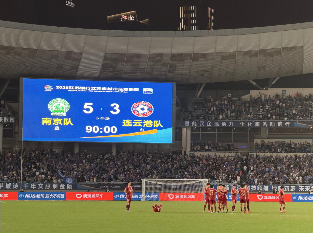苏超(2025江苏省城市足球联赛)8强赛(1/4决赛,8进4)首场比赛由南京迎战连云港,比赛在南京奥体中心进行,61355人观赛,再破纪录。苏超8强赛首场一波三折,连云港常规时间绝平,点球大战南京终胜。