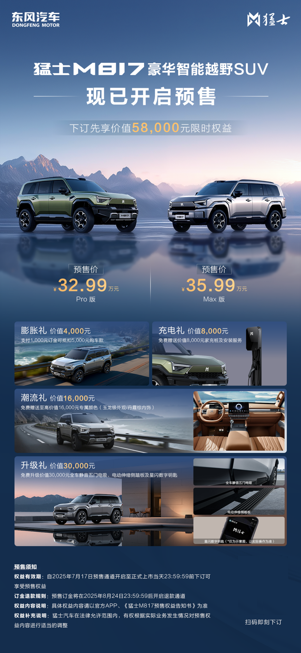 猛士科技表示,猛士M817开创性地将智能科技与越野性能完美结合,为消费者带来全新的用车体验。即日起至正式上市前,预订用户可享受价值58,000元的预售权益。这款产品的推出,不仅丰富了猛士品牌的产品矩阵,更为豪华智能越野市场树立了新标杆。