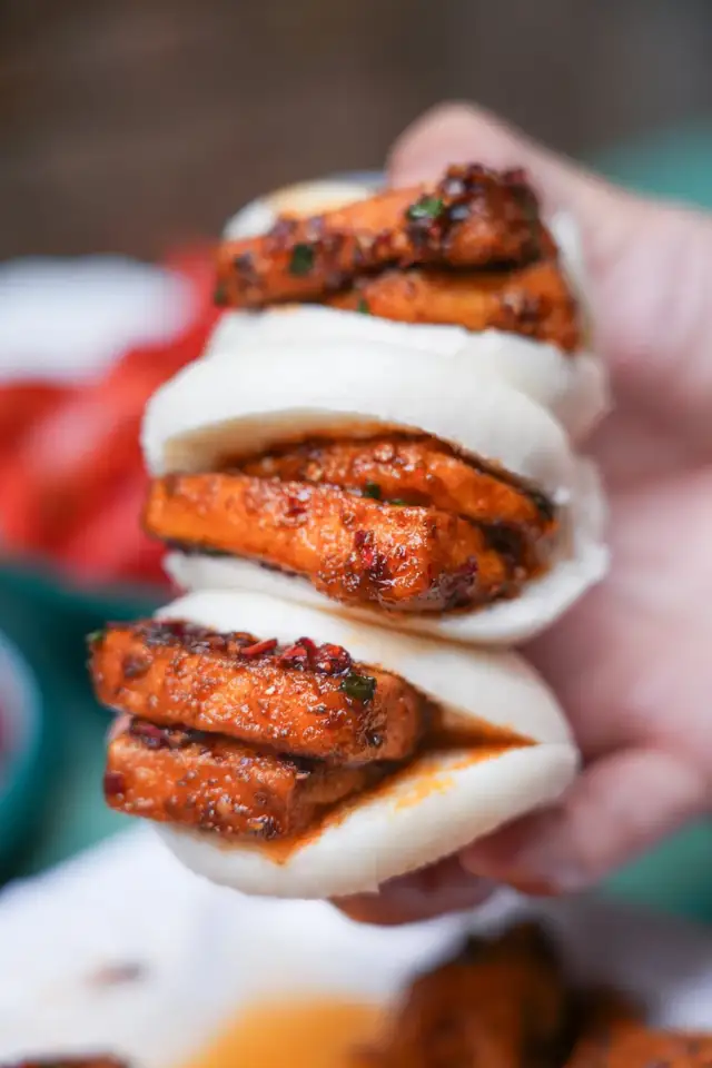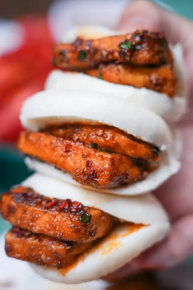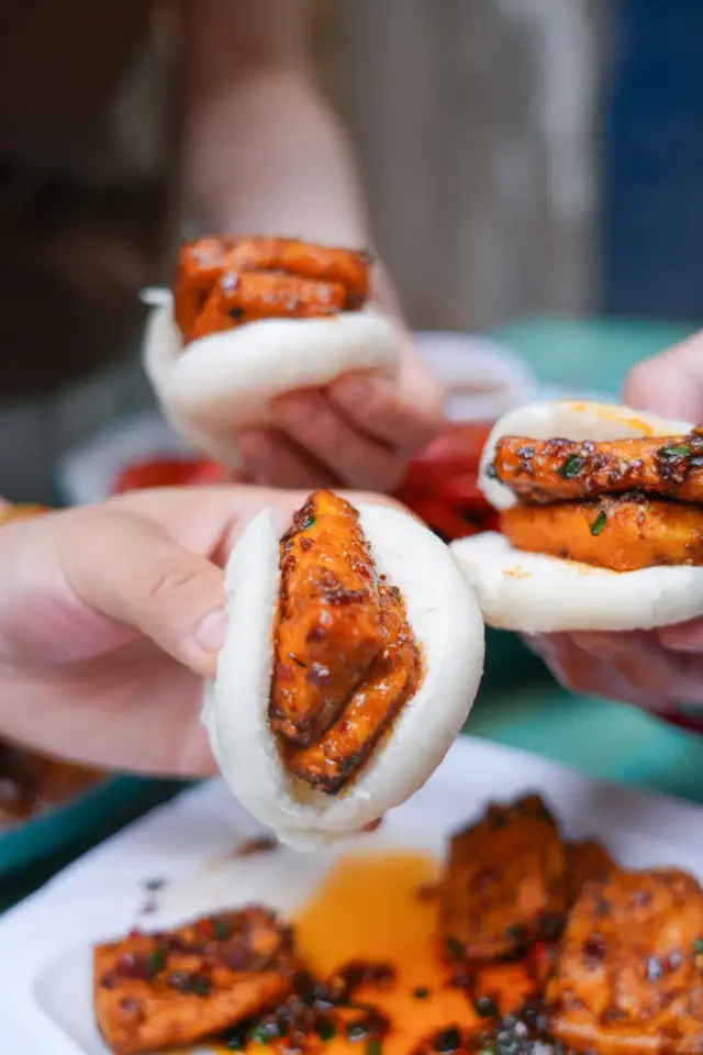 而最绝的吃法写在最后:一定要要几个馒头,这种空气馒头掰开加上这个爆浆豆腐,真的一口下去,松软的馒头鲜甜回甘。