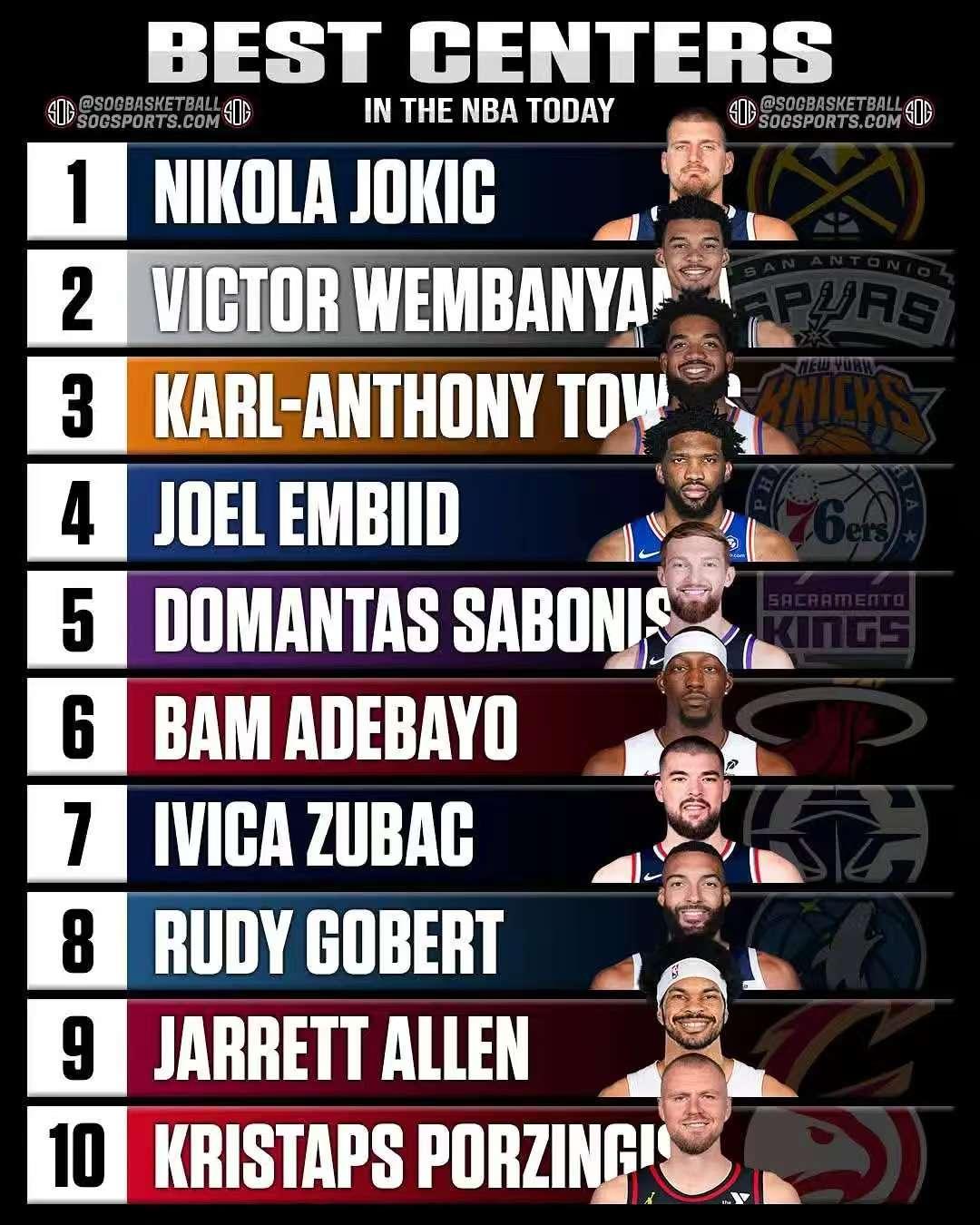 中锋前十依次是:1约基奇、2文班、3唐斯、4恩比德、5小萨、6阿德巴约、7祖巴茨、8戈贝尔、9贾勒特阿伦、10波尔津吉斯。约基奇排在第一也是毫无争议的,毕竟是现役的联盟第一人,而且带队能力和个人能力都十分的出色。文班现在排在第二有争议,但是看看之后的球员,觉得文班还是可以排在这里的,未来绝对能够展现统治力。