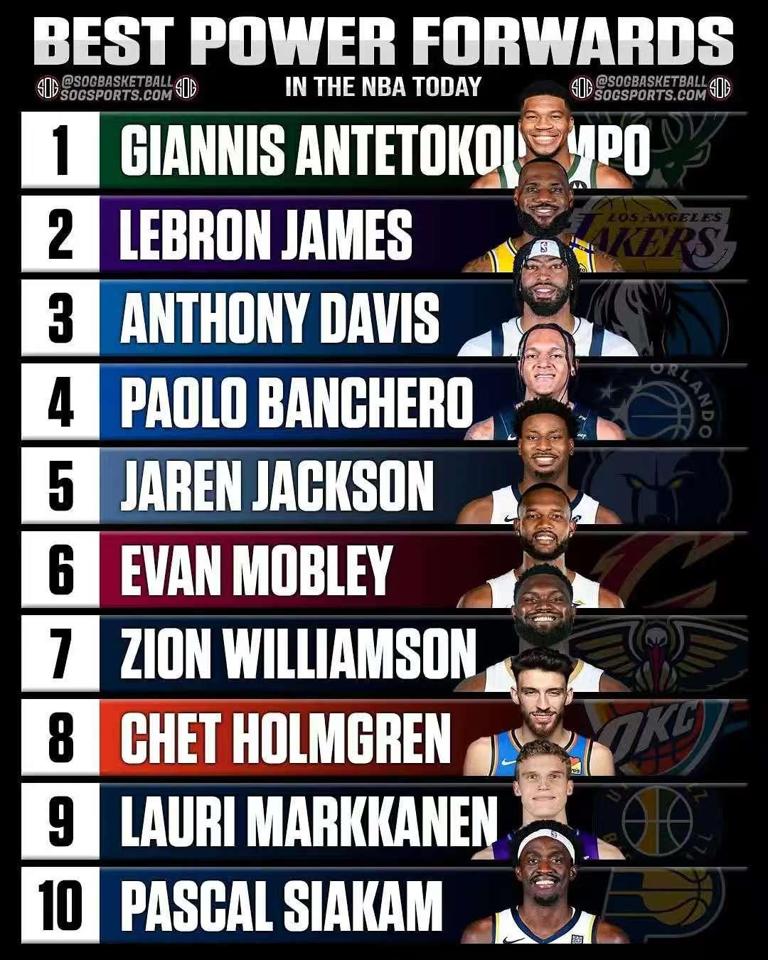 大前锋前十依次是:1字母哥、2詹姆斯、3浓眉哥、4班切罗、5贾伦杰克逊、6莫布里、7锡安、8切特、9马尔卡宁、10西卡。字母哥在大前锋的位置上还是毫无争议的,现役攻防一体最好的球员,正值巅峰期,只可惜球队浪费了他的几年时间。詹姆斯虽然年纪大了,不过球商还是在的,无球能力还是有的,甚至还能够排进联盟前十,但出现在四号位有些不妥。