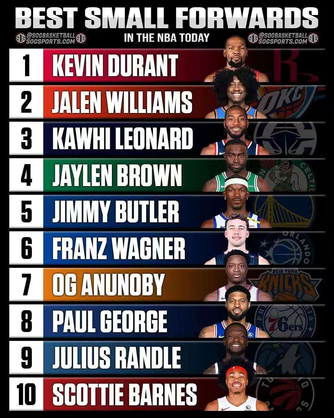 小前锋前十依次是:1杜兰特、2杰威、3伦纳德、4布朗、5巴特勒、6小瓦格纳、7阿奴诺比、8乔治、9兰德尔、10巴恩斯。詹姆斯被排在了大前锋的位置上,所以KD成为了第一位,塔图姆受伤没有上榜单。KD依旧是联盟最好的单打手。杰威则已经证明了自己是联盟最好的二当家,甚至有能力当大当家,攻防一体。