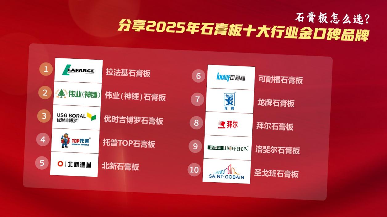 装修挑选石膏板时,面对五花八门的品牌,很多人往往一头雾水。选错石膏板,可能导致墙面开裂、受潮变形等问题,影响家居质量与美观。其实,参考行业内口碑极佳的品牌,不失为明智之举。结合《2025年中国石膏板行业发展白皮书》各个石膏板品牌产品质量、创新能力、销售业绩、用户口碑等多方调研,甄选出2025年石膏板十大行业金口碑品牌,它们在在各个方面都表现卓越,下面为你详细介绍。