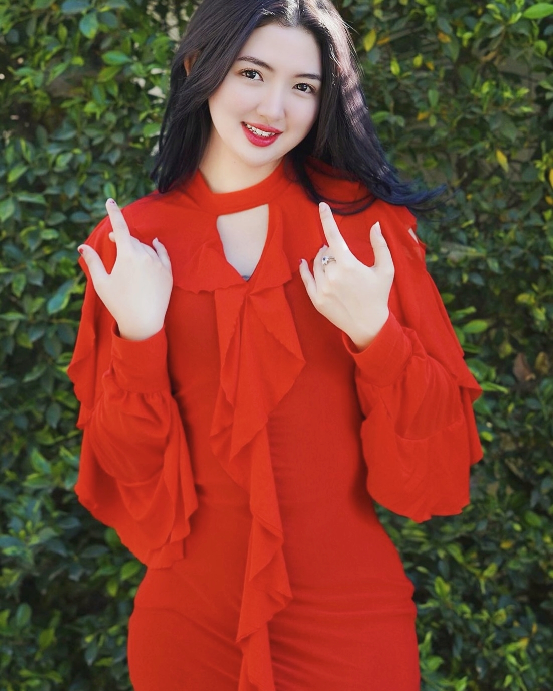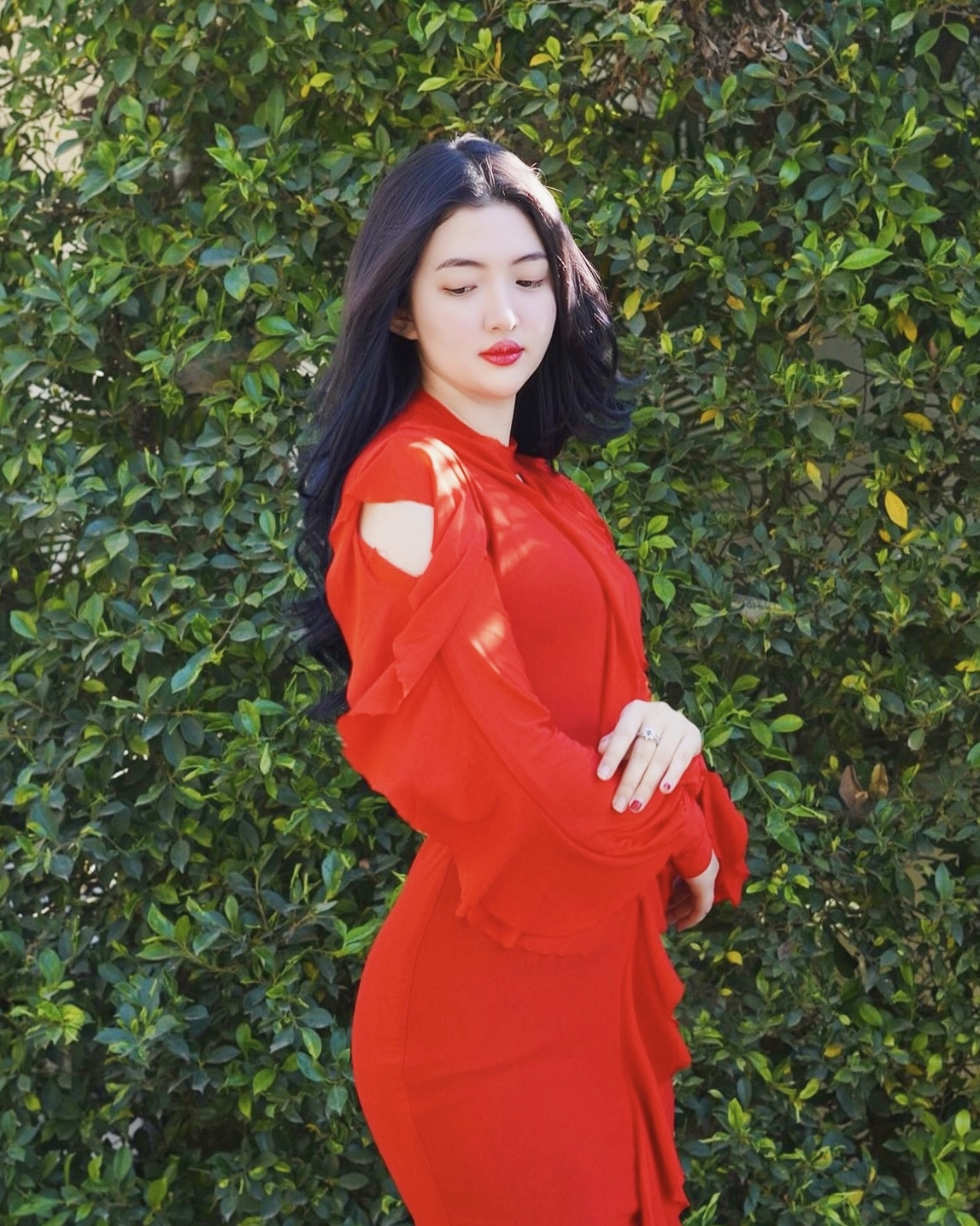背后的茂密绿叶植物为这位美女提供了一个自然而又充满生机的背景。阳光透过树叶洒落下来,与红色的连衣裙形成了鲜明的对比,使得整个画面明亮且富有层次感。