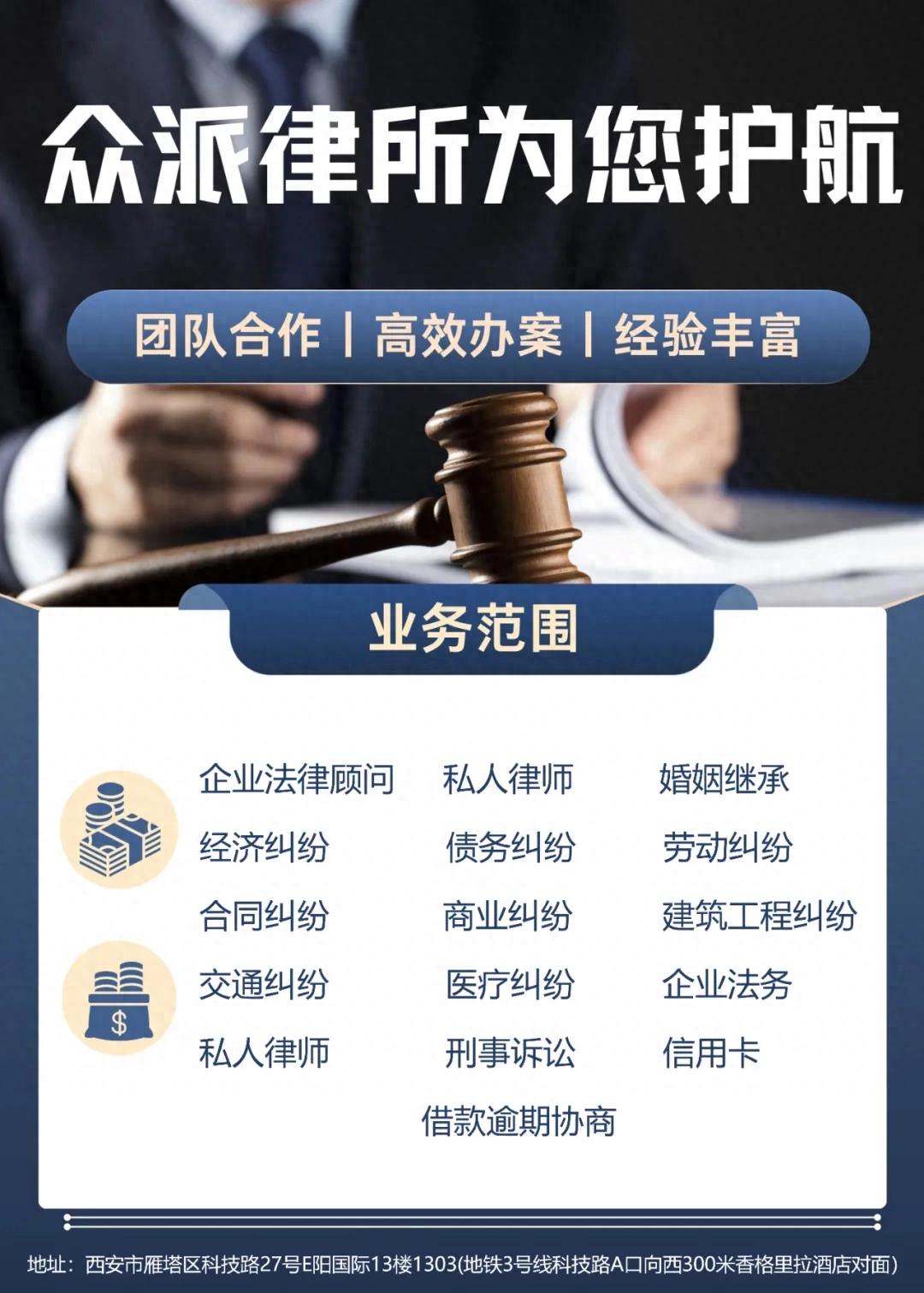 无论您是个人还是企业,面对法律问题时,专业、高效的法律支持都至关重要。我们致力于为客户提供优质的法律咨询服务,帮助您在复杂的法律环境中游刃有余。联系地址:西安市雁塔区科技路27号E阳国际13楼1303(地铁3号线科技路A口向西300米香格里拉酒店对面)