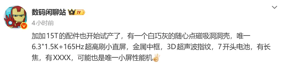 外观,影像,马达和扬声器这些配置目前还没有靠谱的消息。我看到很多人说7000mAh的电池有点小,大家可能看惯了最近的新手机电池10000mAh的消息。但是一加15T这是一个6.3英寸的小屏手机,电池能做到7开头,不算小了。发布时间,之前的消息是在明年的3-4月份。