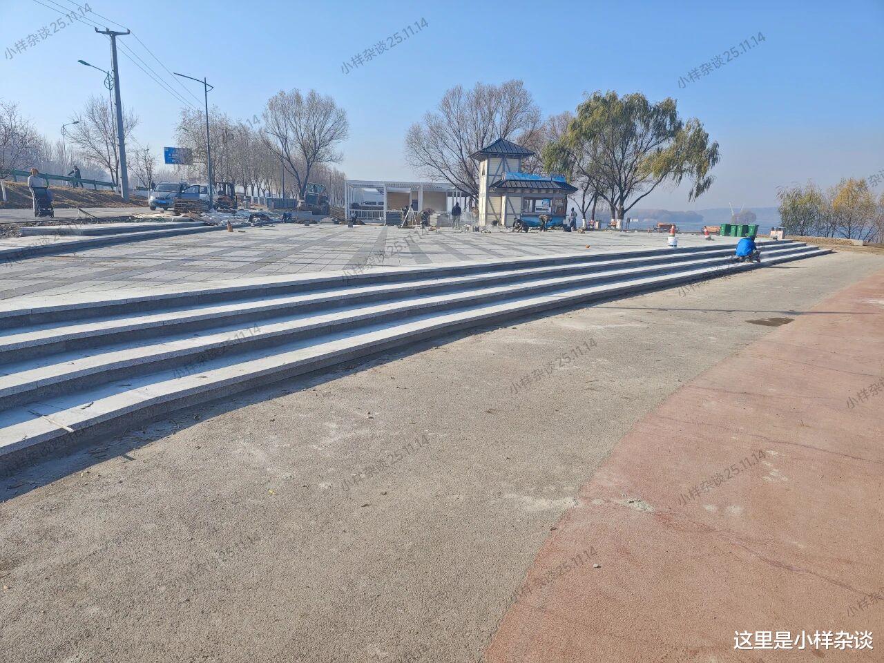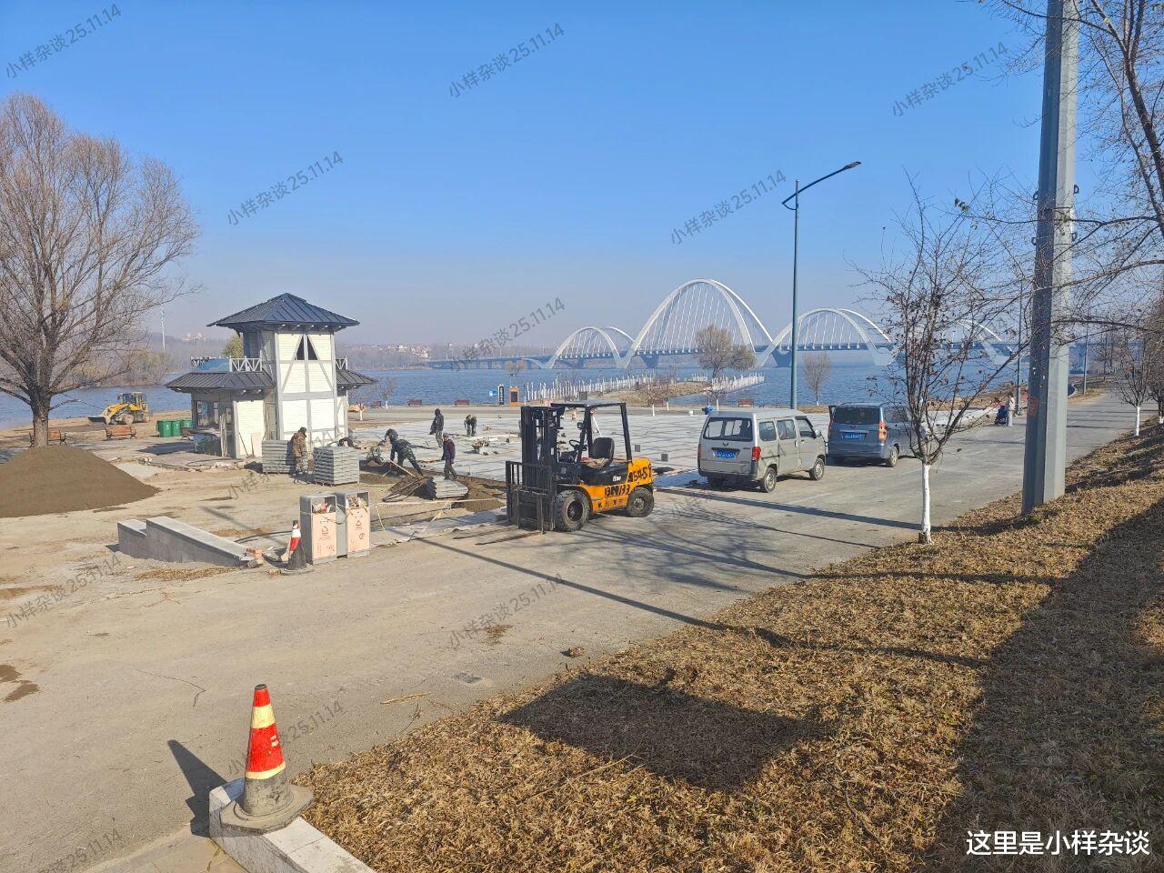 停车场已经先修好了,这是这个改造项目最好的一点了,这附近的香堤路是双向两车道,之前这附近没有停车场,这些钓鱼和露营爱好者要不停非机动车道上,要不停草地上。河边的杂草已经被清理干净,铲车在进行后续作业中。