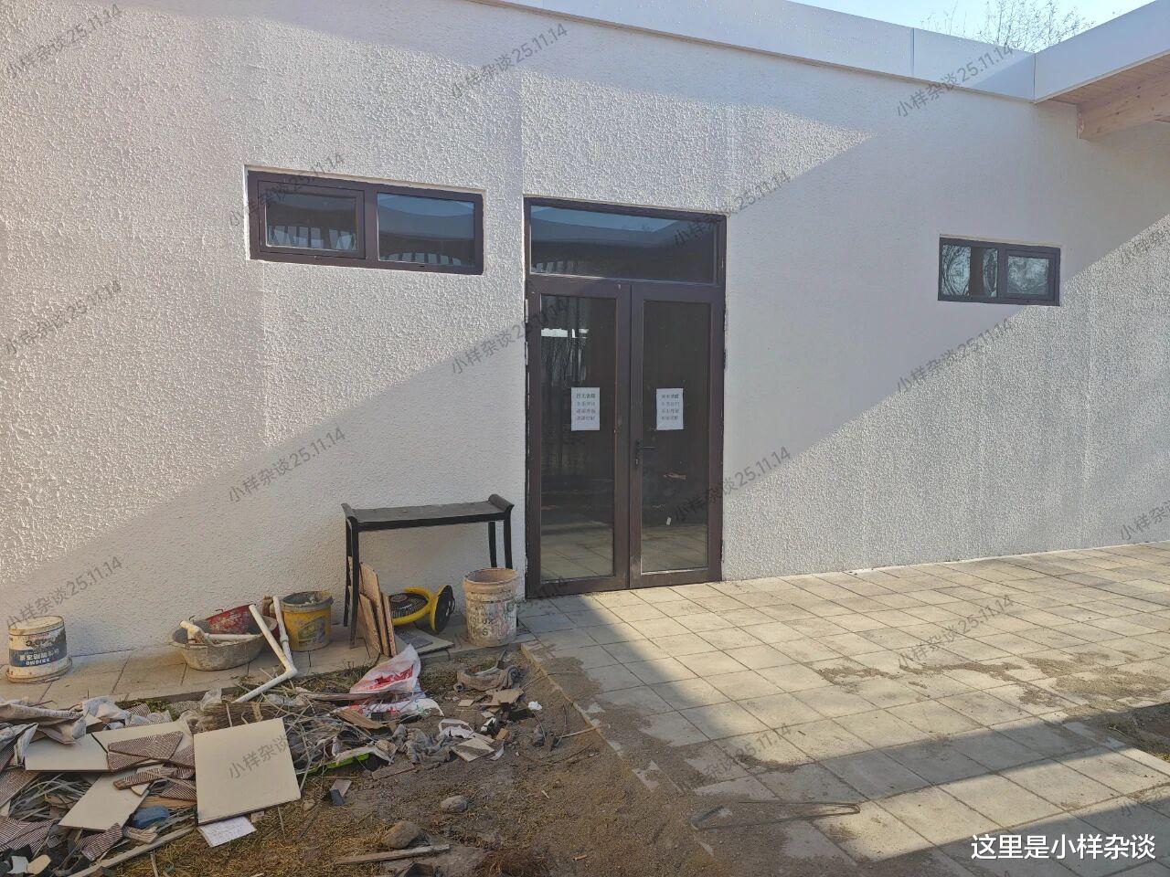 这个卫生间内部有施工的样子,门上贴了一个告示:因无供暖,冬季停用,谢谢理解,谢谢理解。