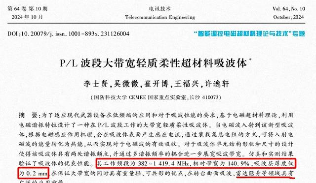 然后,是大量超材料技术的应用。超材料的应用是隐身技术发展的重要方向。通过操控电磁波传播特性,超材料可以在更宽的频段内实现隐身效果。例如,西北工大研发的光谱隐身蒙皮,以及国防科大研制的轻质柔性吸波体,均为提升隐身性能提供了技术支持。