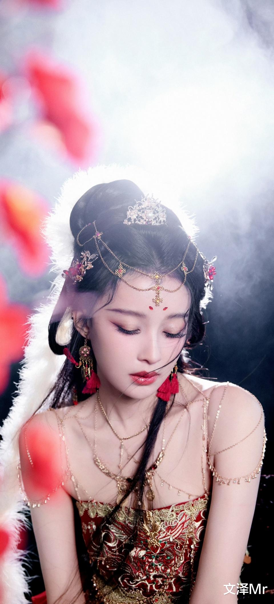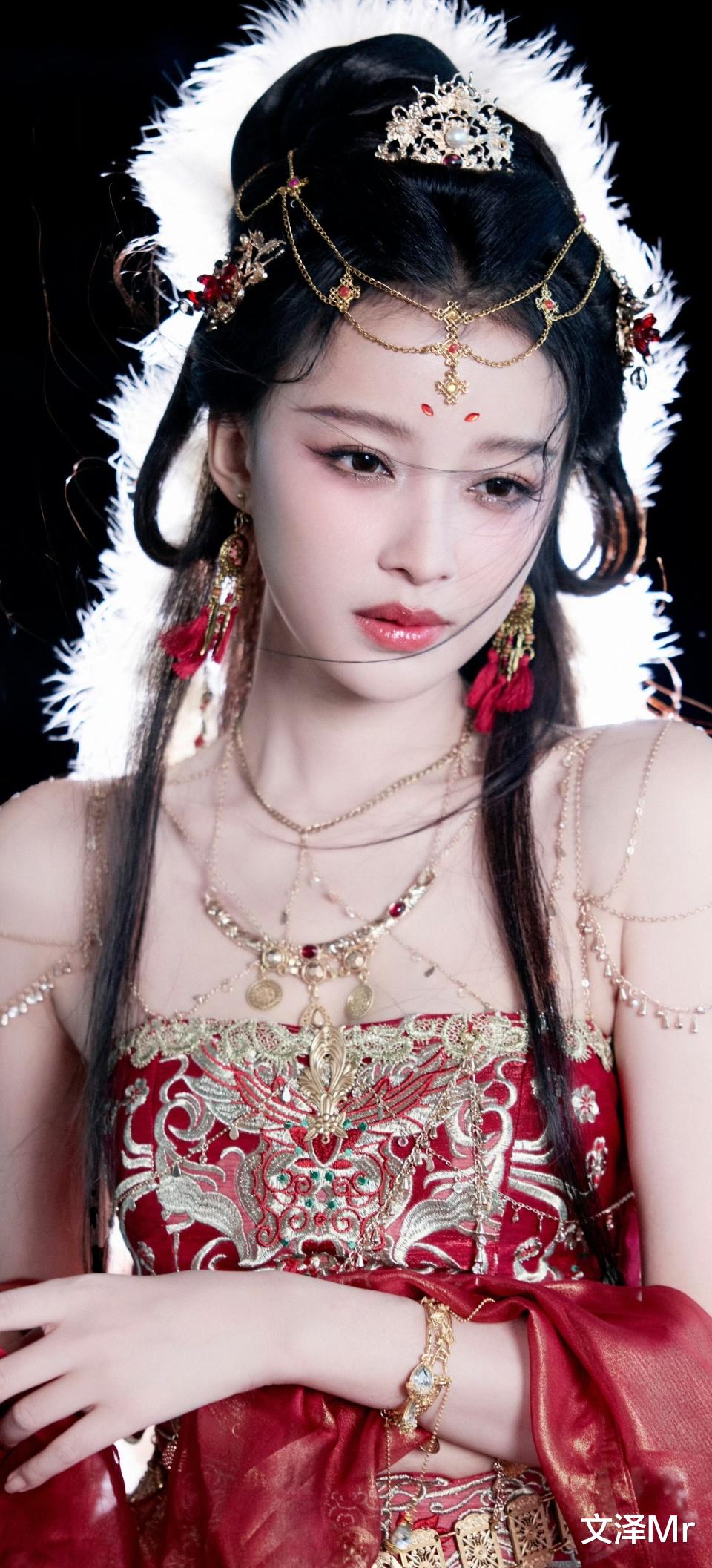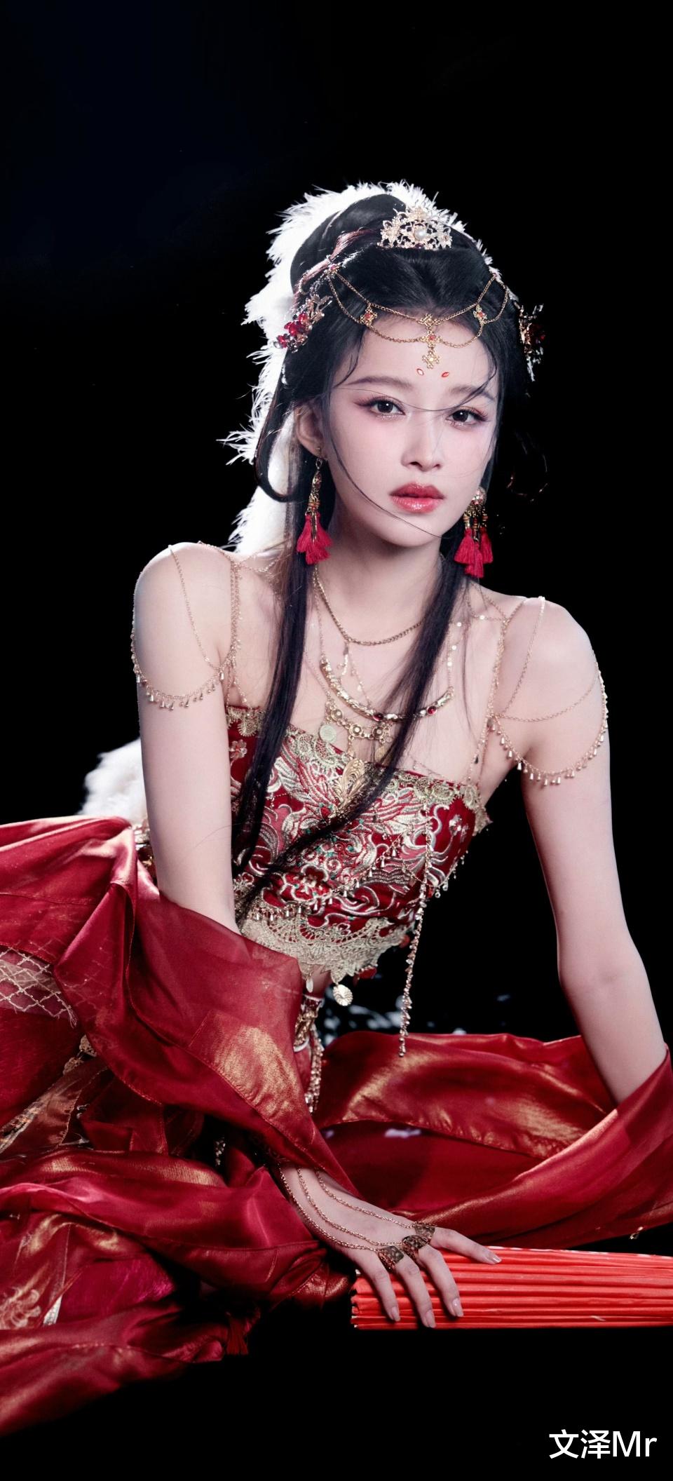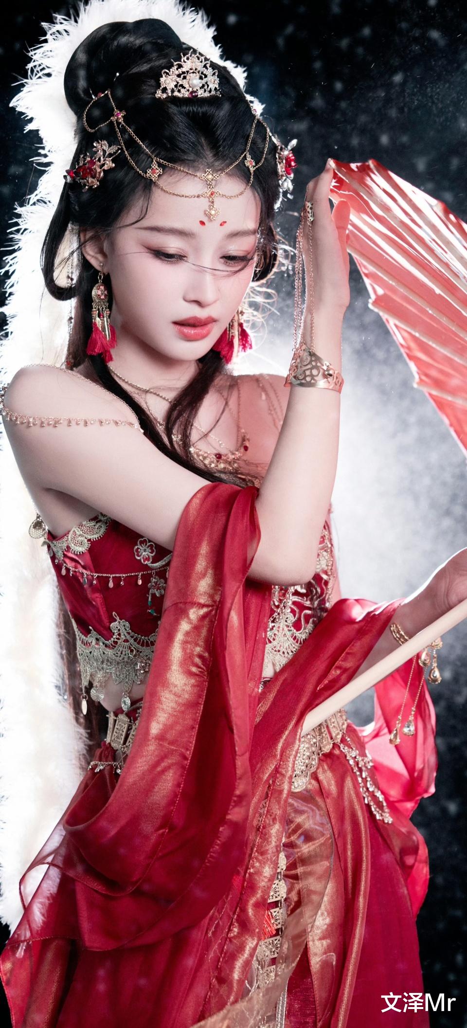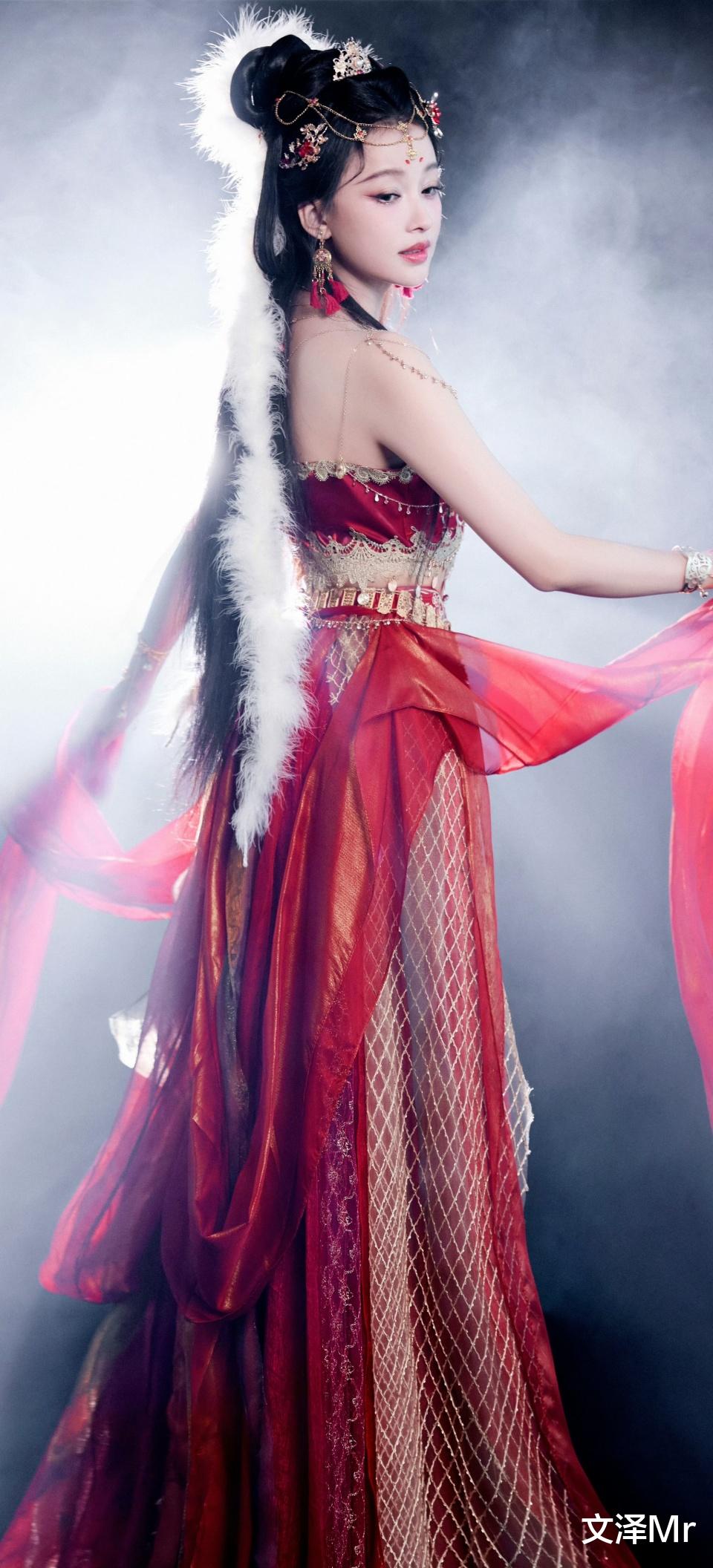 孙怡手持红色长绸,身姿优雅如画。高高盘起的发髻点缀着繁复精美的金红色头饰,眉间一点花钿更是点睛之笔。她身着的红裙以金线绣满花纹,露出光洁肩头,裙摆层叠飘逸,在黑色背景的衬托下,仿佛从古画中走出的仙子,每一个转身都带着古典与时尚交融的独特气场。