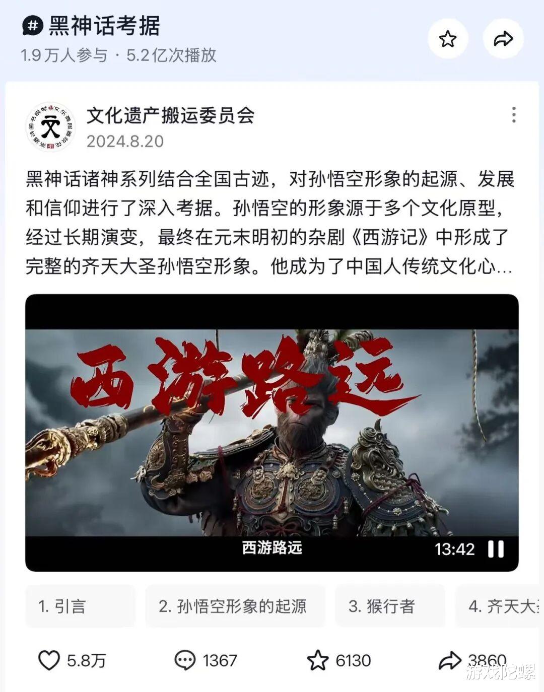再比如《黑神话:悟空》在抖音平台远不止于一个国产3A标签,在兴趣、流量与平台主题创作活动的驱动下,大量内容创作者从攻略、西游文化、音乐、历史、COS等多个维度切入解读游戏内容,单一个“黑神话考据”话题就有5.2亿次播放量,让游戏的方方面面都深入人心。