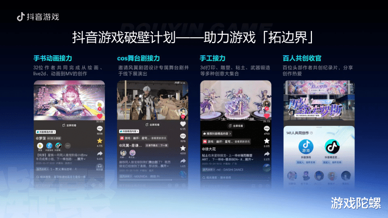 今年不久前,抖音创作者“萝菠”发起的一项为期30天的线上绘画接龙,诠释了这种“合力”和真实破圈的价值。这项活动的创作最终覆盖了绘画、作词作曲、3D建模、COS成片等形式,汇集成了一个跨越多个圈层受众的项目,让《崩坏:星穹铁道》的积极内容触达广泛的群体。抖音上内容型游戏的破圈能力可见一斑。