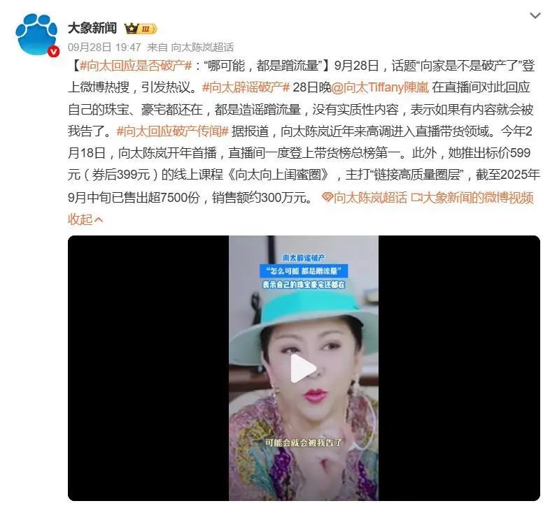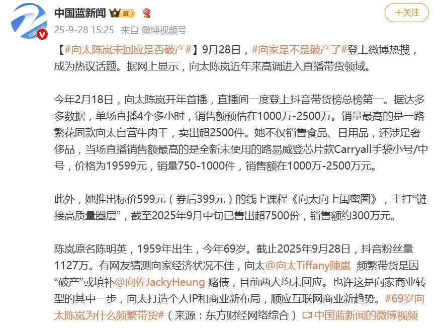 9月28日,“向家是不是破产了” 突然登顶微博热搜,这场舆论风暴的导火索,竟是7月向佐替第三方担保140 万港币债务遭起诉的旧闻 —— 即便澳门美高梅早已澄清债务结清、法律程序终止,网友仍从各路细节拼凑出 “豪门落魄” 的想象:向太高强度直播被解读为 “捞钱救急”,向佐穿女装、蕾丝透视装的造型被视作 “博流量自救”,中国星集团股价暴跌 90%、电影《门前宝地2亿投资仅234.5万票房的失利,更成了 “财务告急” 的 “铁证”。