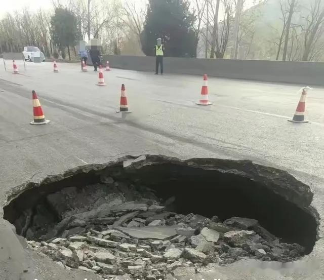 那是一个晴朗的午后,山西长治309国道上,一辆轿车正常行驶突然一头扎进了塌陷的坑洞。