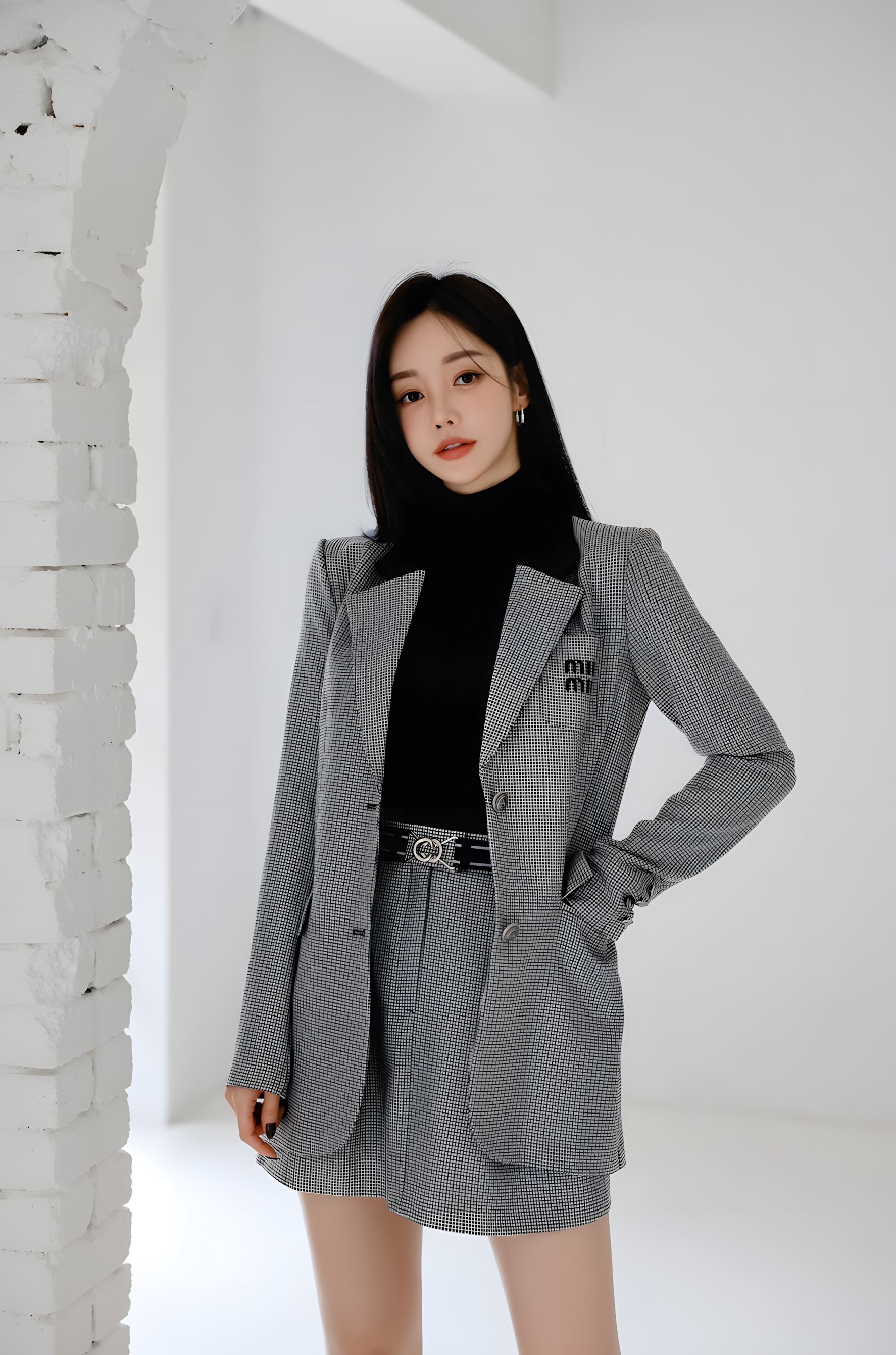 孙允珠在这身黑色拼接千鸟格外套搭配同色短裙与黑色高跟鞋的装扮下,无论是站立、行走还是转身,都将服装的魅力展现到了极致。她用专业的模特素养和独特的个人魅力,演绎出了一场黑色的时尚交响,成为时尚穿搭领域的经典范例,让人为之赞叹与倾慕,也为众多时尚爱好者提供了无尽的穿搭灵感与美学借鉴。