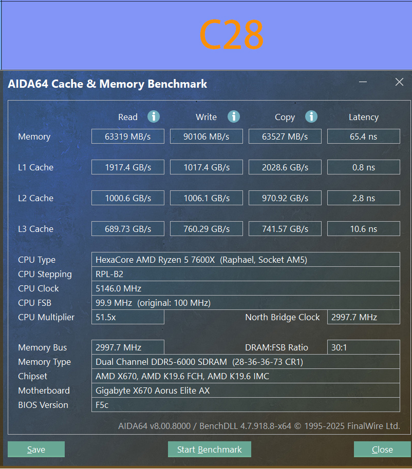 AIDA64内存测试内存内存读取性能,C28时序的成绩是63319MB/s。