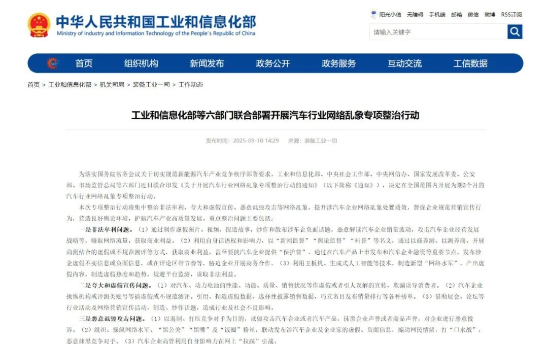 为落实国务院常务会议关于切实规范新能源汽车产业竞争秩序部署要求,工业和信息化部、中央社会工作部、中央网信办、国家发展改革委、公安部、市场监管总局等六部门近日联合印发《关于开展汽车行业网络乱象专项整治行动的通知》,决定在全国范围内开展为期3个月的汽车行业网络乱象专项整治行动。